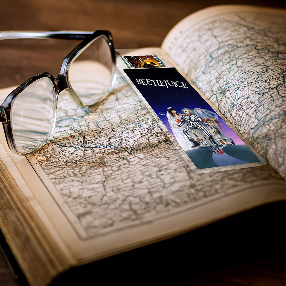 - Bold Double-Sided Design – Officially licensed Beetlejuice 2” x 6” FilmCells™ Bookmark featuring Beetlejuice, Lydia Deetz, and the Maitlands on the front, with a sandworm-inspired design on the back.