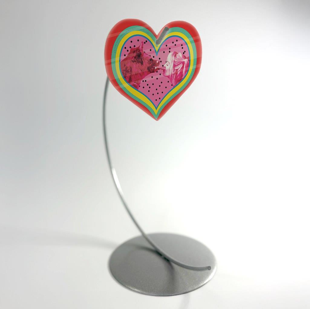 Celebrate chaos and love with this vibrant Harley Quinn & Bruce the Hyena Heart-Shaped Acrylic Print. Officially licensed by DC Comics and Warner Bros., this bold piece showcases Harley Quinn nose-to-nose with her beloved pet hyena, Bruce. The dynamic pop-art style features vivid pink tones, layered heart outlines in red, green, yellow, and blue, and a playful polka-dot background.
