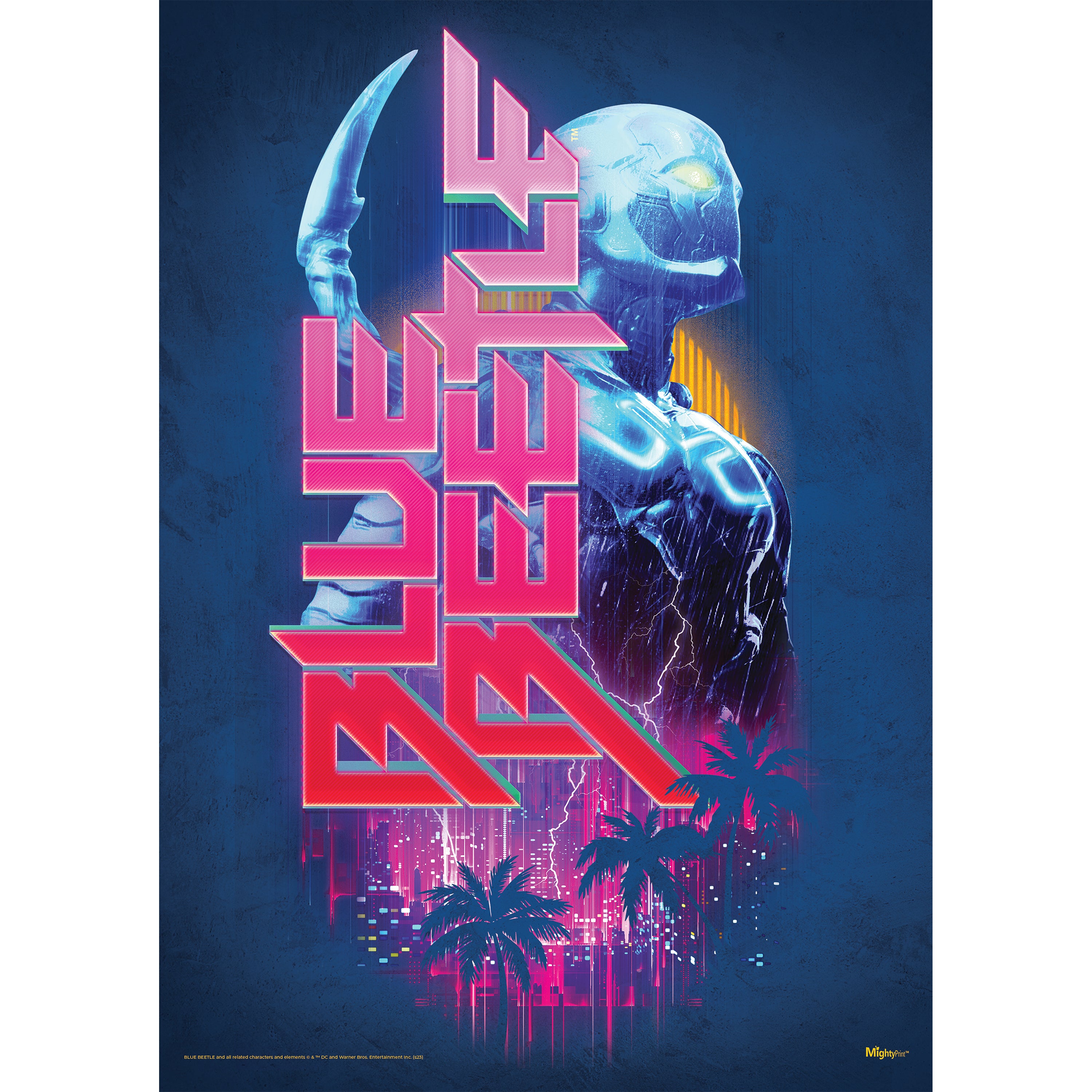 The Blue Beetle's city. This 17" x 24" MightyPrint Wall Art features a larger-than-life Blue Beetle along with the hero's name in a striking pink above a cityscape of Palmera City against a dark blue background. The hope of the city.