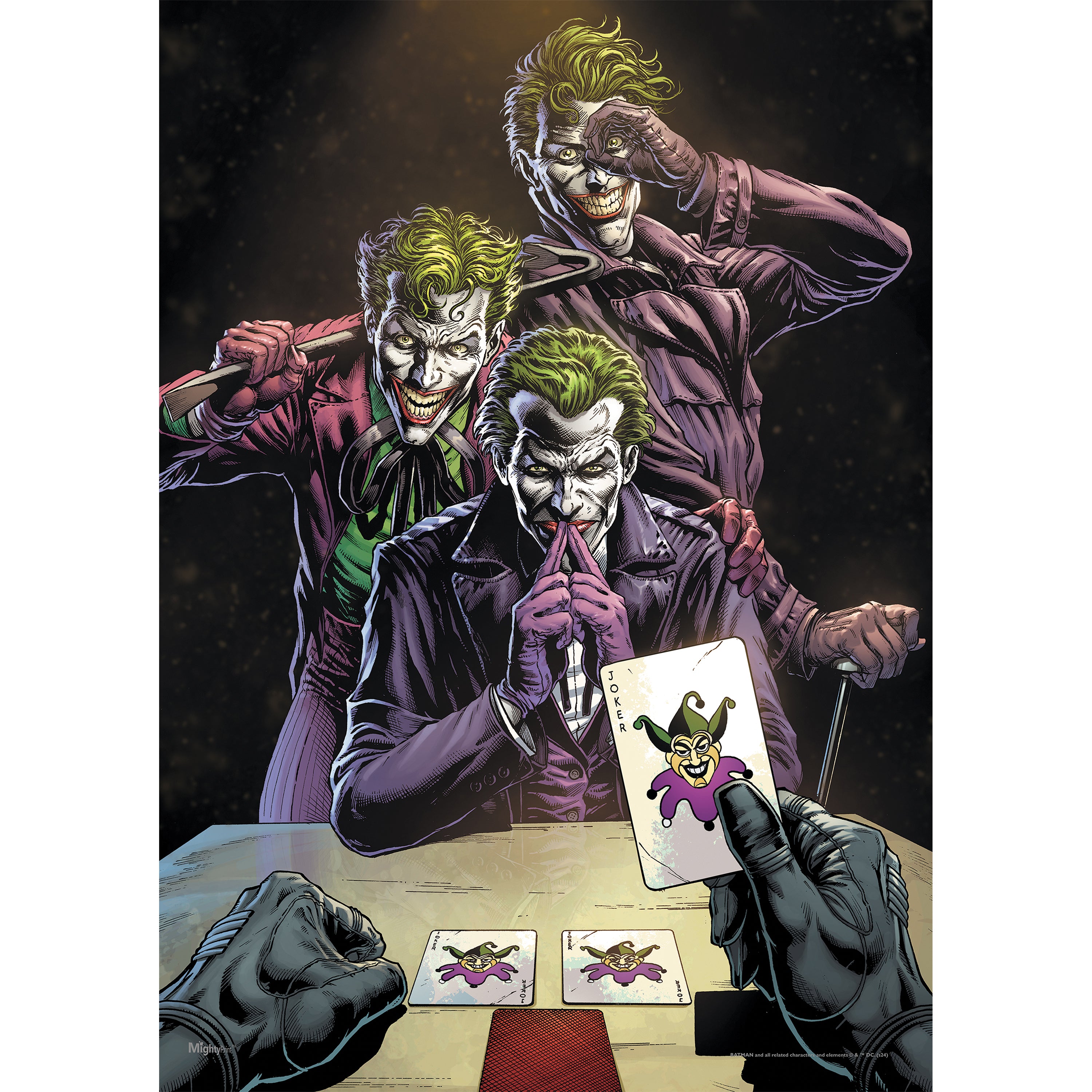 The Criminal, The Clown and The Comedian. The Three Jokers subset of Batman comics is a favorite amongst many DC Comics fans. This 17” x 24” MightyPrint Wall Art features promotional art from Jason Fabok for Batman: Three Jokers. The design features the three Jokers playing a game of cards. We can see the dealer’s hand as it holds a Joker card as two other Joker cards sit in front of him. One Joker has a Poker face while the others are grinning ear-to-ear – perhaps because the Joker never loses a bet.