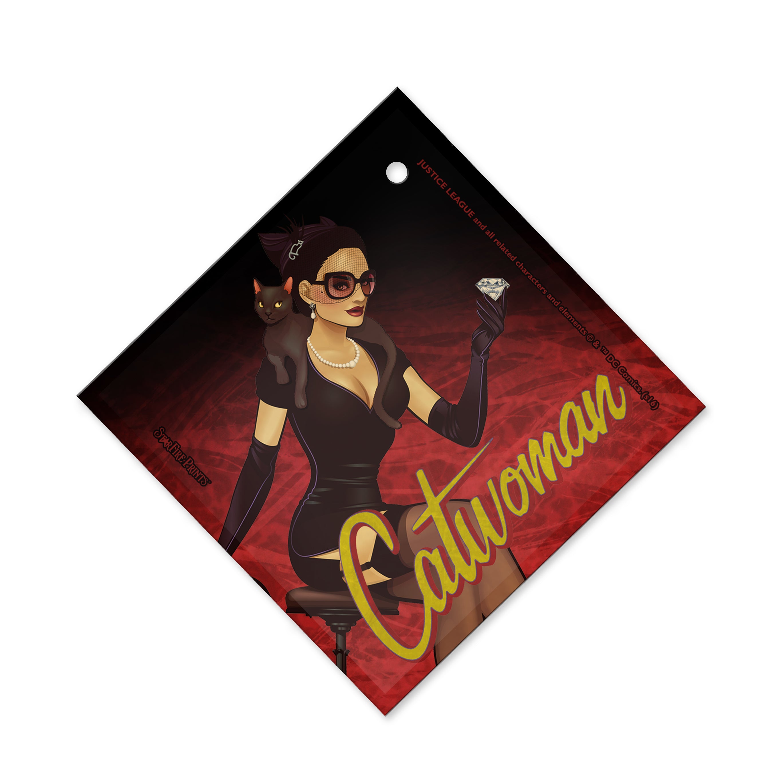 Catwoman is sleek, cool and (of course) holding a giant diamond and wearing a cat on her shoulders. Contessa Selina Digatti is 1940s glam, as she appears in the alternate Bombshells history of DC Comics. Bring the DC Bombshells to your home with this StarFire Prints™ Glass Art. This collectible print is translucent yet vibrant with color, features an officially licensed image of Catwoman.