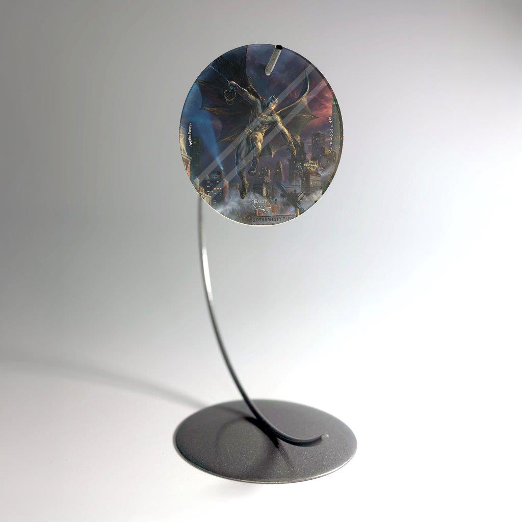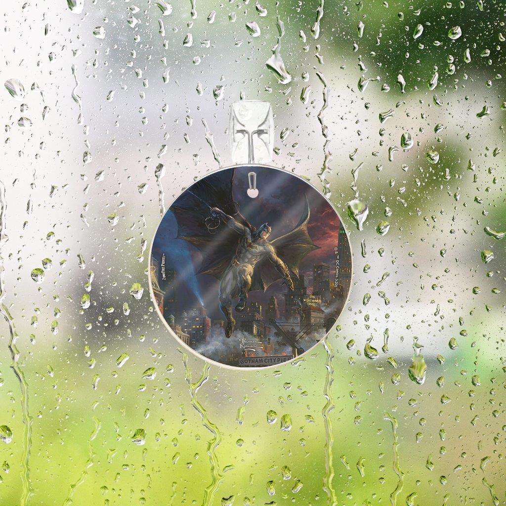 Batman is swinging into action on this glass art. Designed with original artwork by Thomas Kinkade, the Dark Knight is seen on this 3.5” accessory joining the rest of the Justice League members (not pictured) during the showdown at Gotham City Pier.