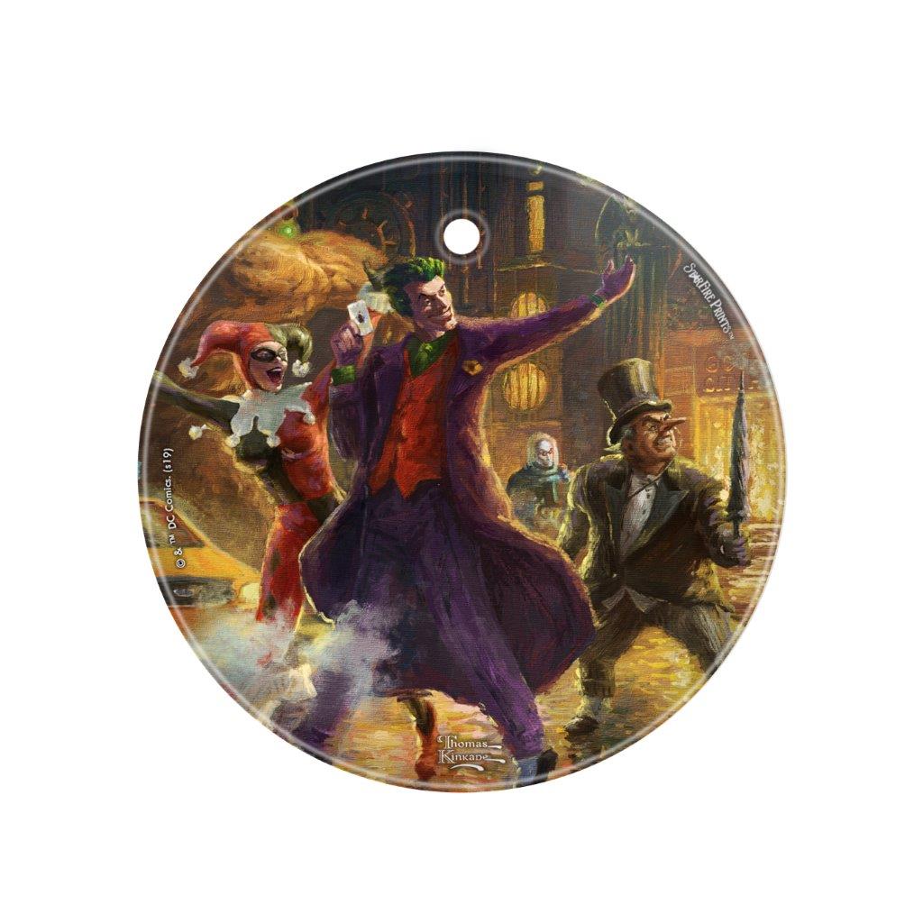 - Stunning Glass Display – This 3.5” round and 3/16” thick DC Comics light-catching glass art featuring the Joker, Harley Quinn, Mr. Freeze, and Penguin beautifully enhances any space, whether placed near a window, on a shelf, or as part of a collection.
