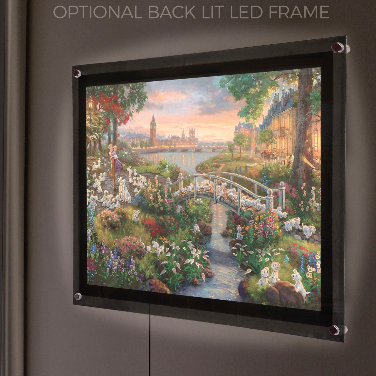 - Officially licensed Disney artwork by Thomas Kinkade Studios featuring Roger and Anita with Pongo, Perdita, and playful dalmatian puppies in a glowing London garden scene.