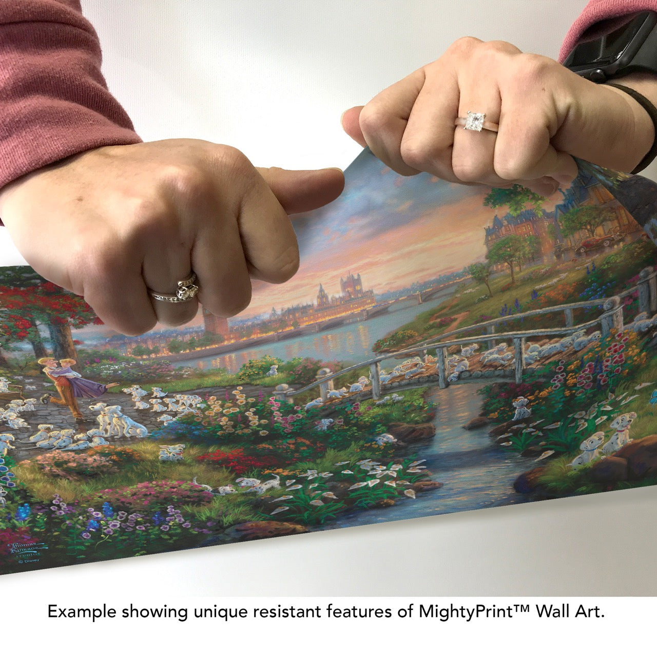 Bring a little Disney magic to your space with this 24" x 17" MightyPrint™ Wall Art featuring a dreamy London riverside moment from Disney’s 101 Dalmatians. Beneath a warm sunset sky, Roger and Anita share a romantic scene as Pongo and Perdita look on—while dozens of adorable dalmatian puppies tumble through a flower-filled garden, across a charming footbridge, and along winding stone paths. With Big Ben and the Westminster skyline glowing in the distance, this artwork adds instant color, comfort, and storybook charm to nurseries, kids’ rooms, playrooms, or any Disney-loving space.