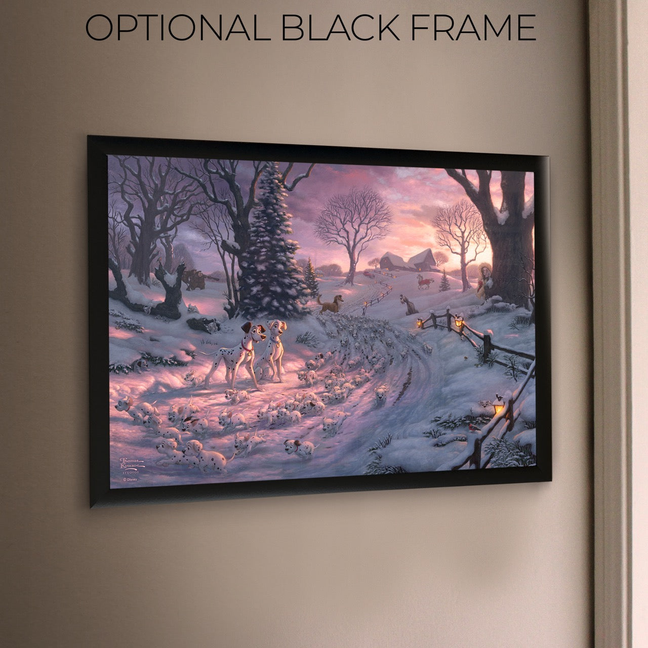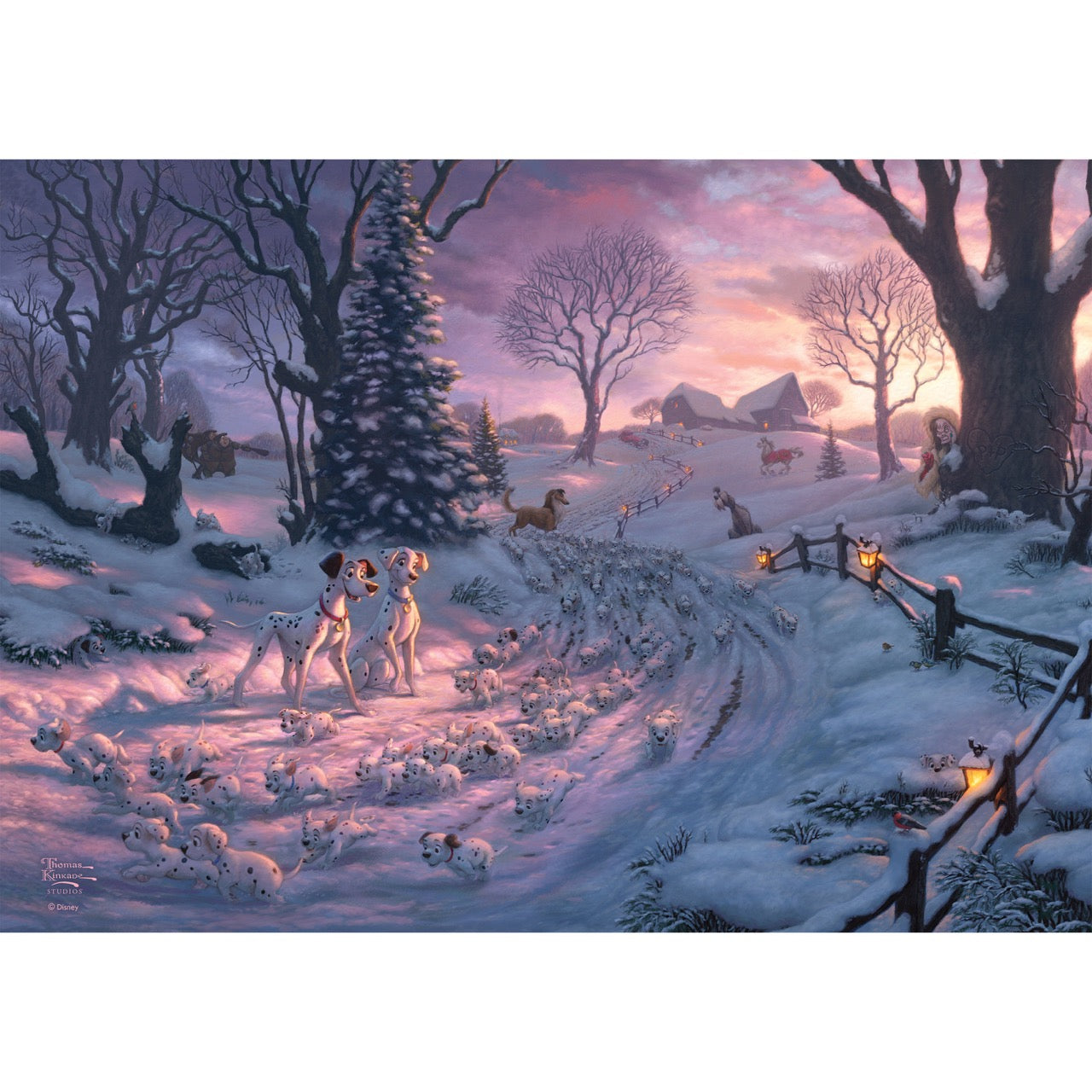 - Officially licensed Disney artwork by Thomas Kinkade Studios featuring Pongo and Perdita with their Dalmatian puppies racing through a snowy countryside at sunset, with Cruella de Vil and her henchmen hidden among the trees.