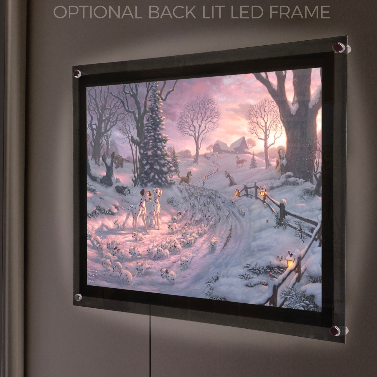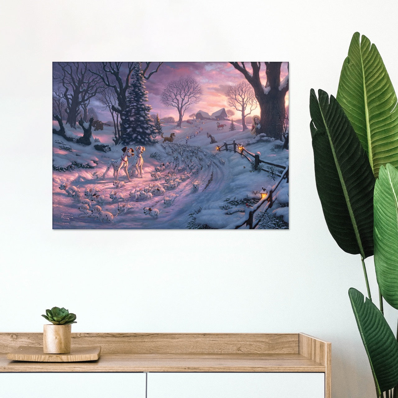 Bring a little storybook magic to your walls with this 24" x 17" MightyPrint™ Wall Art, featuring the warm, glowing charm of Thomas Kinkade Studios paired with Disney’s 101 Dalmatians. In a dreamy winter landscape, the snow sparkles under a pastel sunset as Pongo and Perdita watch their playful puppies race down a winding country lane—while Cruella de Vil (and trouble not far behind) lurks in the shadows. It’s the perfect mix of cozy and mischievous, made for Disney fans who love art that feels like a scene you can step into.