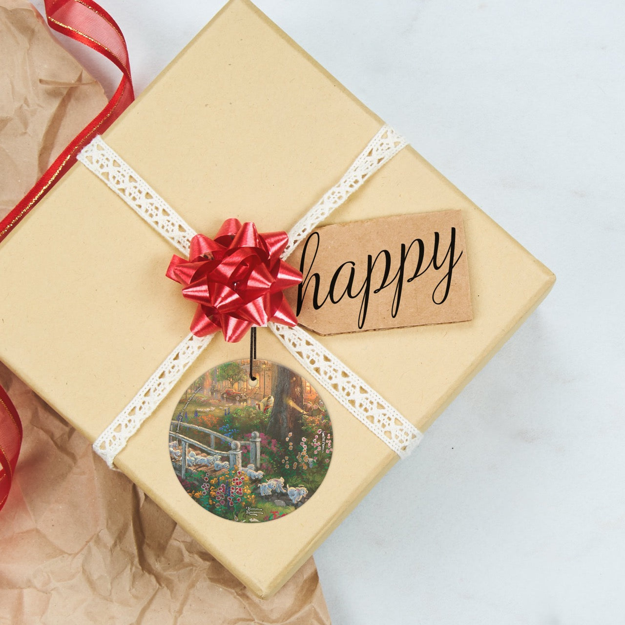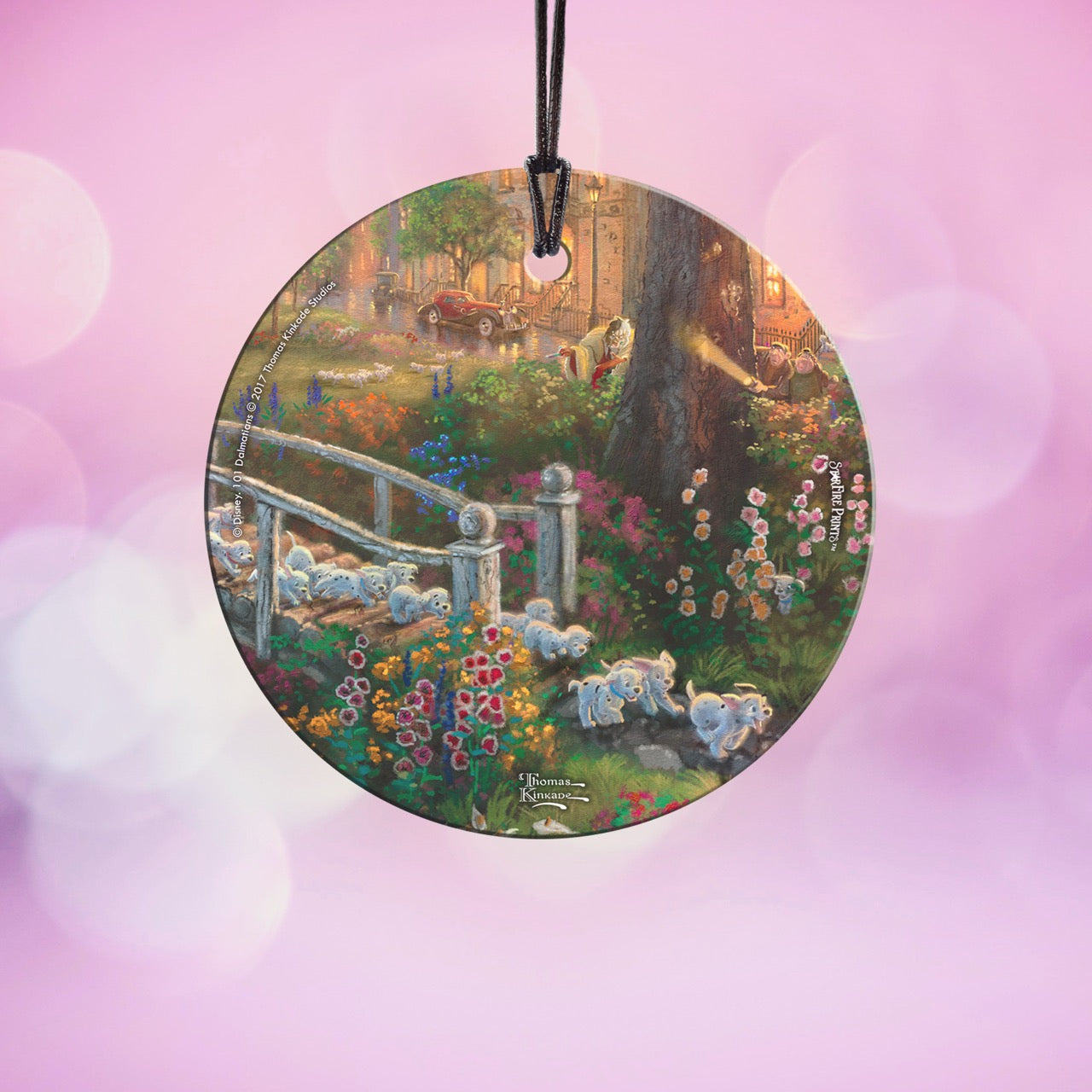 - Stunning Glass Display – This 3.5” round and 3/16” thick Thomas Kinkade Studios Disney light-catching hanging glass print features a parade of playful Dalmatian puppies trotting across a flower-covered bridge.