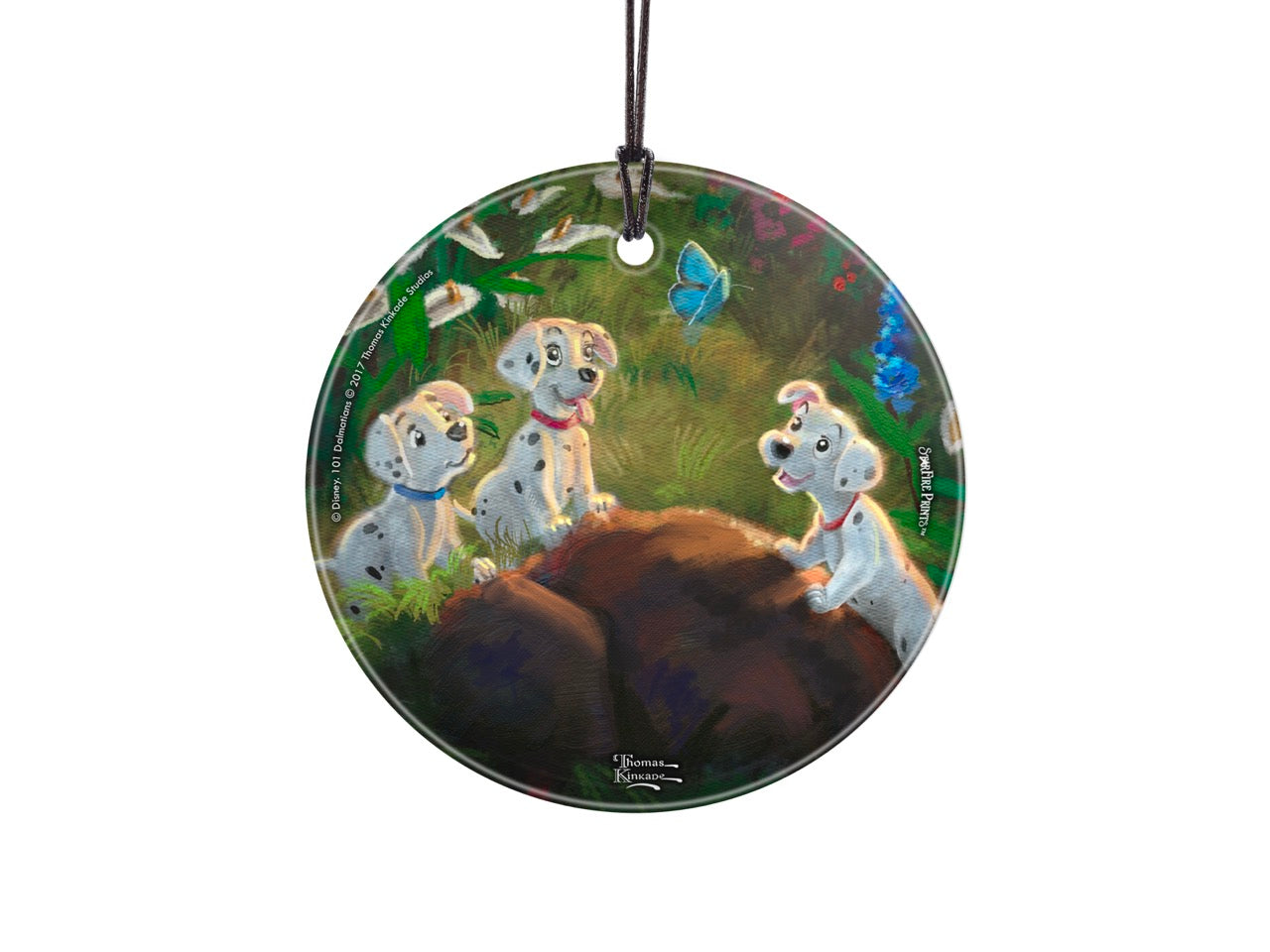 - Stunning Glass Display – This 3.5” round and 3/16” thick Thomas Kinkade Studios Disney light-catching hanging glass print features three playful Dalmatian puppies discovering a butterfly in a lush garden, surrounded by colorful flowers and sunlight.