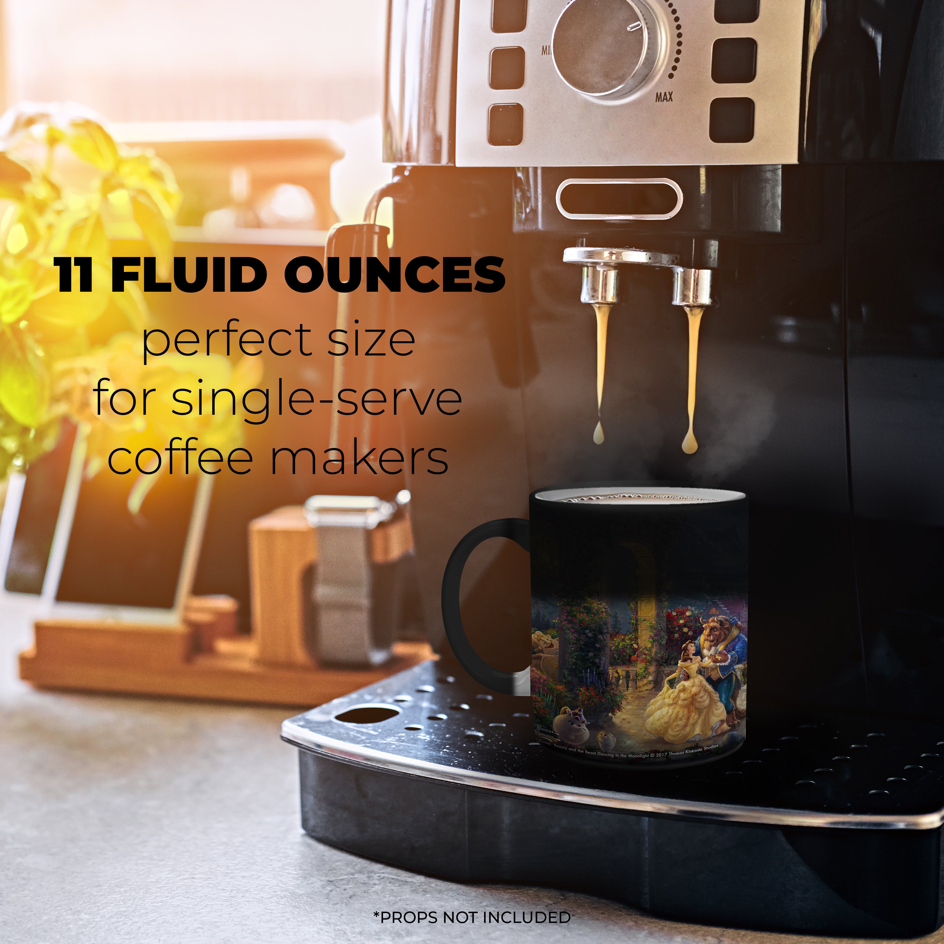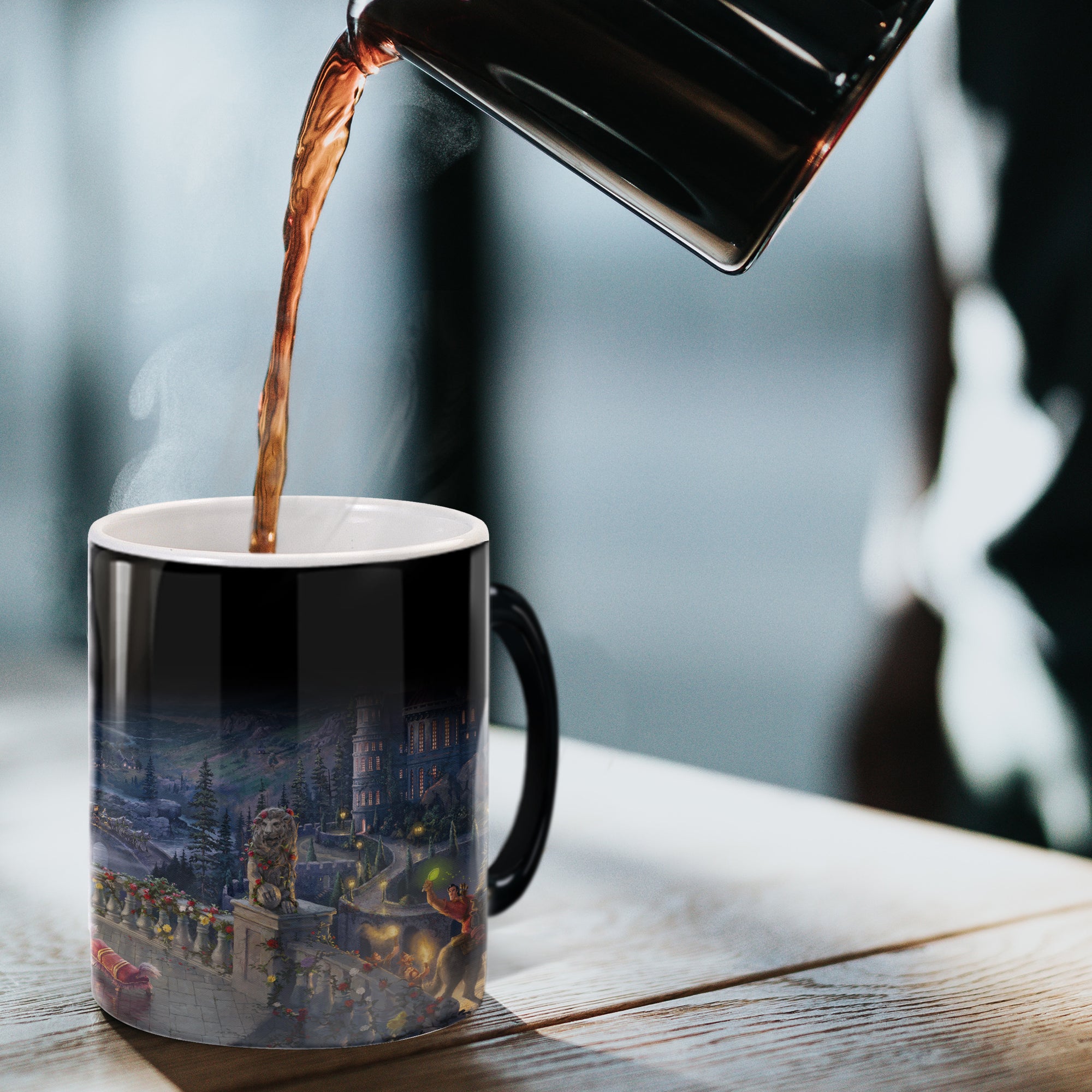 Just as the Beast reveals his true form to Belle, so too will this heat-sensitive, image-revealing mug! This mug features the timeless image of Belle and the Beast sharing a dance in the moonlight from Disney’s Beauty and the Beast; masterfully rendered by Thomas Kinkade Studios. Mrs. Potts, Chip, and Sultan look on as Gaston and the townspeople arrive. The exterior of this officially licensed 11oz mug transforms from black as hot liquid is added, revealing the hidden image in full vivid colors.