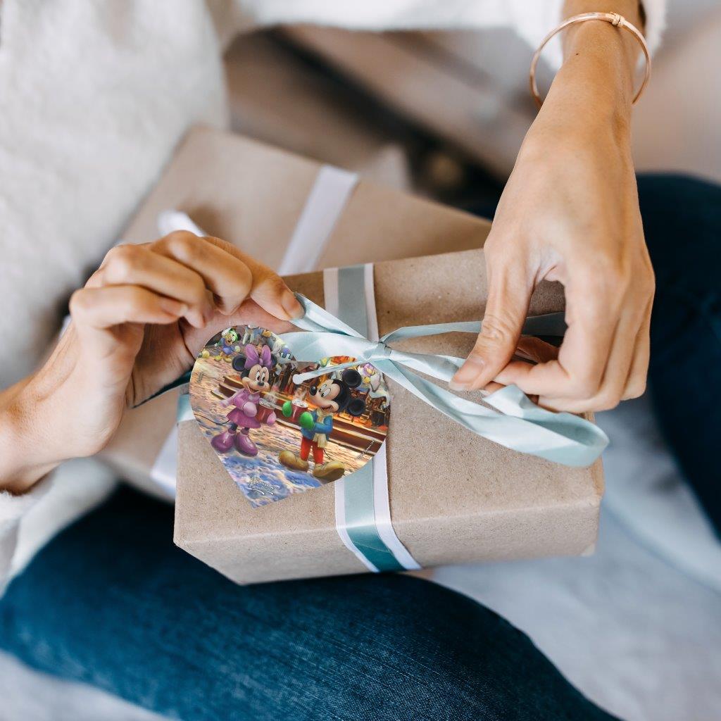 Bring a little extra magic to your holiday season with this heart-shaped hanging acrylic print featuring Mickey Mouse and Minnie Mouse sharing hot cocoa at a glowing Christmas market. Inspired by the artistry of Thomas Kinkade Studios, this charming piece captures twinkling lights, cobblestone streets, and warm seasonal cheer in vivid color and detail. Hung in a window, on a stand, or on a festive display, it’s a sweet reminder of cozy winter nights spent with the ones you love.