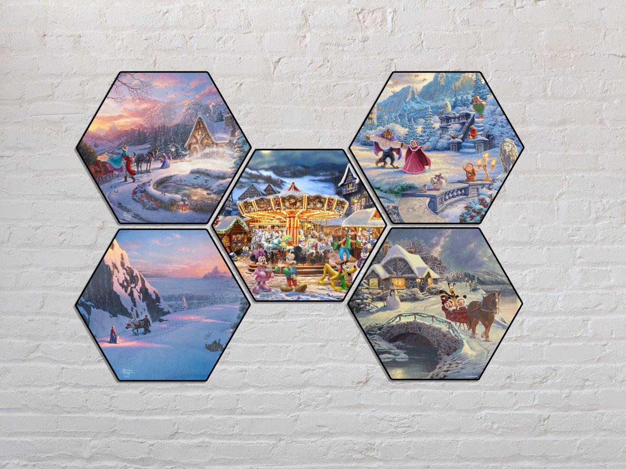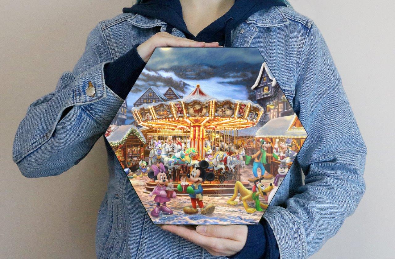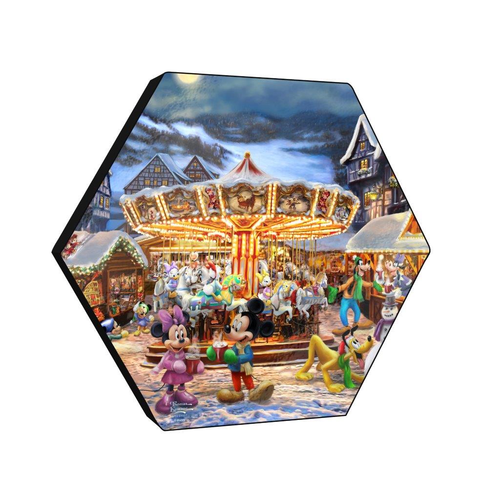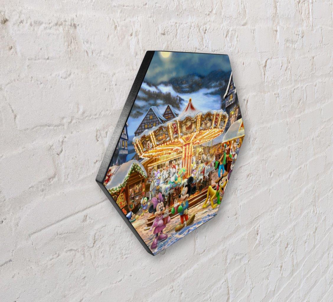 - Hexagonal Wood Print – Officially licensed Thomas Kinkade Studios Disney design featuring Disney’s Mickey and Minnie enjoying a magical Christmas market.