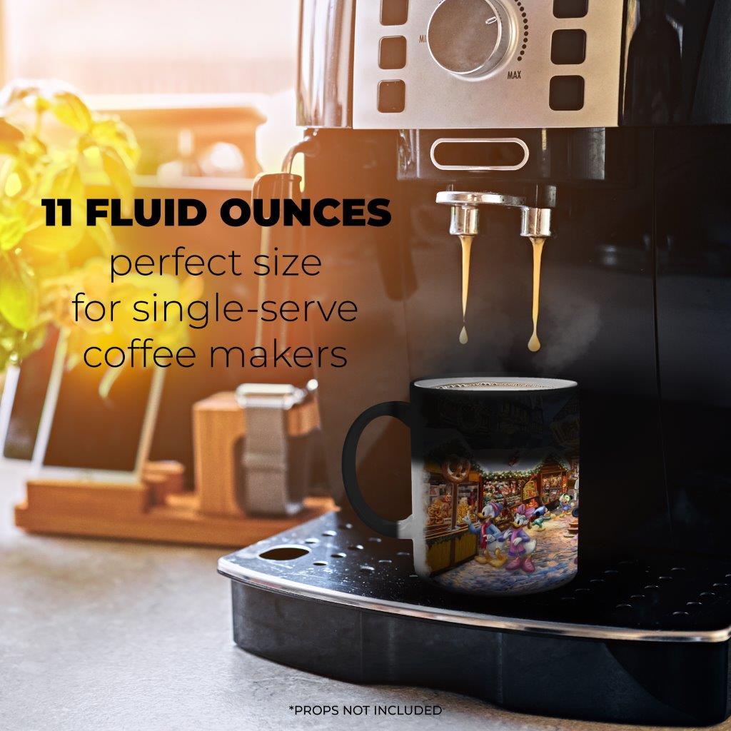 Bring a little Disney magic to every coffee break with this Morphing Mugs® Heat-Sensitive Mug featuring the “Mickey and Minnie Christmas Market” artwork by Thomas Kinkade Studios. When the mug is cold, the design is hidden behind a dark, mysterious exterior. Just add hot liquid and watch the scene come to life, revealing Mickey, Minnie, Donald, Daisy, Goofy, Pluto, and more friends enjoying a festive Christmas market and glowing carousel in a snowy village. It’s a cozy, color-changing collectible that turns your morning coffee, cocoa, or tea into a holiday moment you’ll look forward to all year long.
