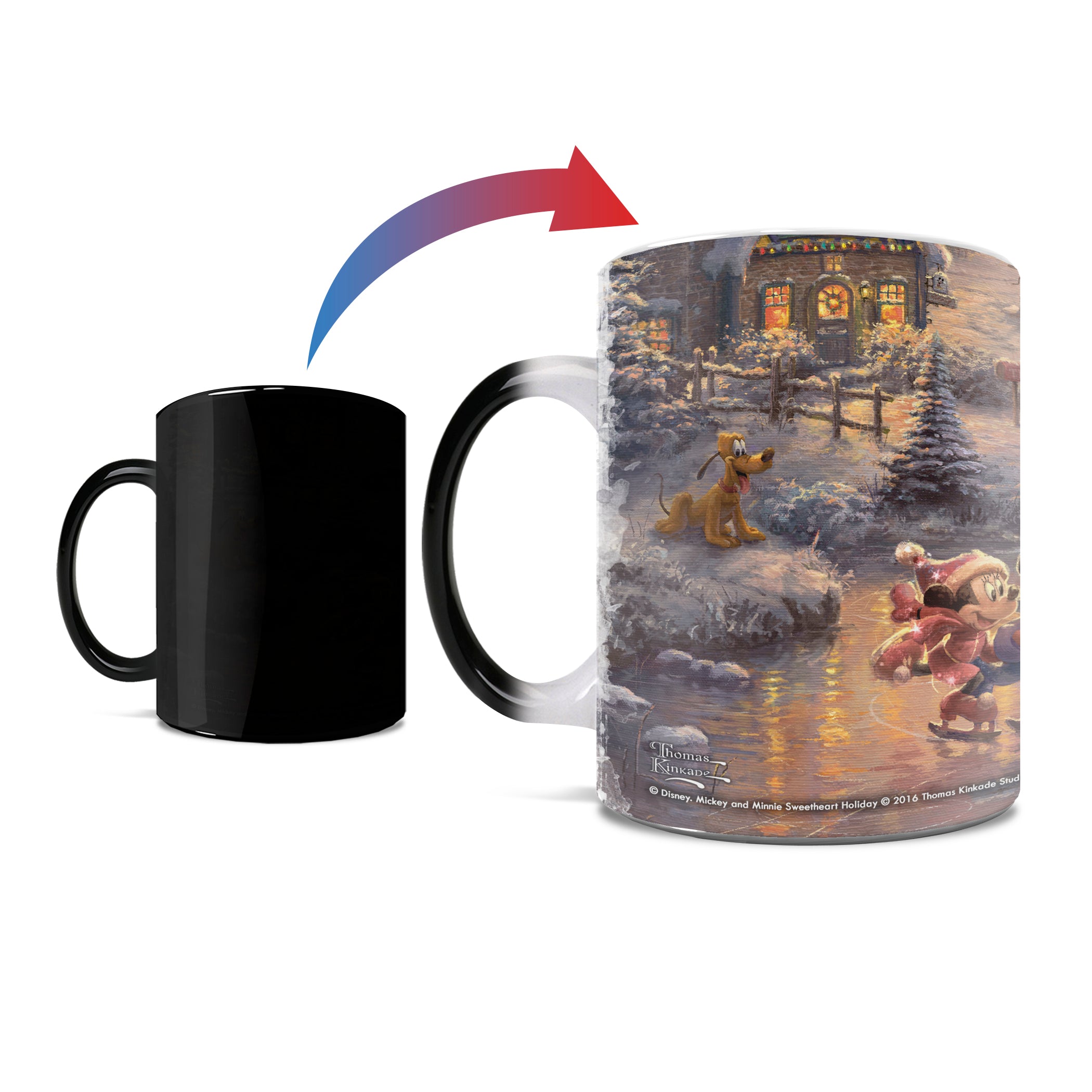 Mickey and Minnie are full of Holiday cheer as they skate together on a frozen stream. Mickey's best pal, Pluto, is joyous, watching from the snowy banks. Like all works of art from Thomas Kinkade Studios, there are many charming details in this image. From the twinkling Christmas lights on the quaint village homes to the sweet little cardinal perched atop a wooden sled, "Sweetheart Holiday" is full of Christmas cheer. You can imagine the families tucked inside of the warmly-lit homes, enjoying time together and hoping their wishing-well wishes come true on Christmas morning. As you warm your hands around a freshly poured cup of coffee, tea, or hot cocoa, this image appears, reminding you of your own holiday wishes.