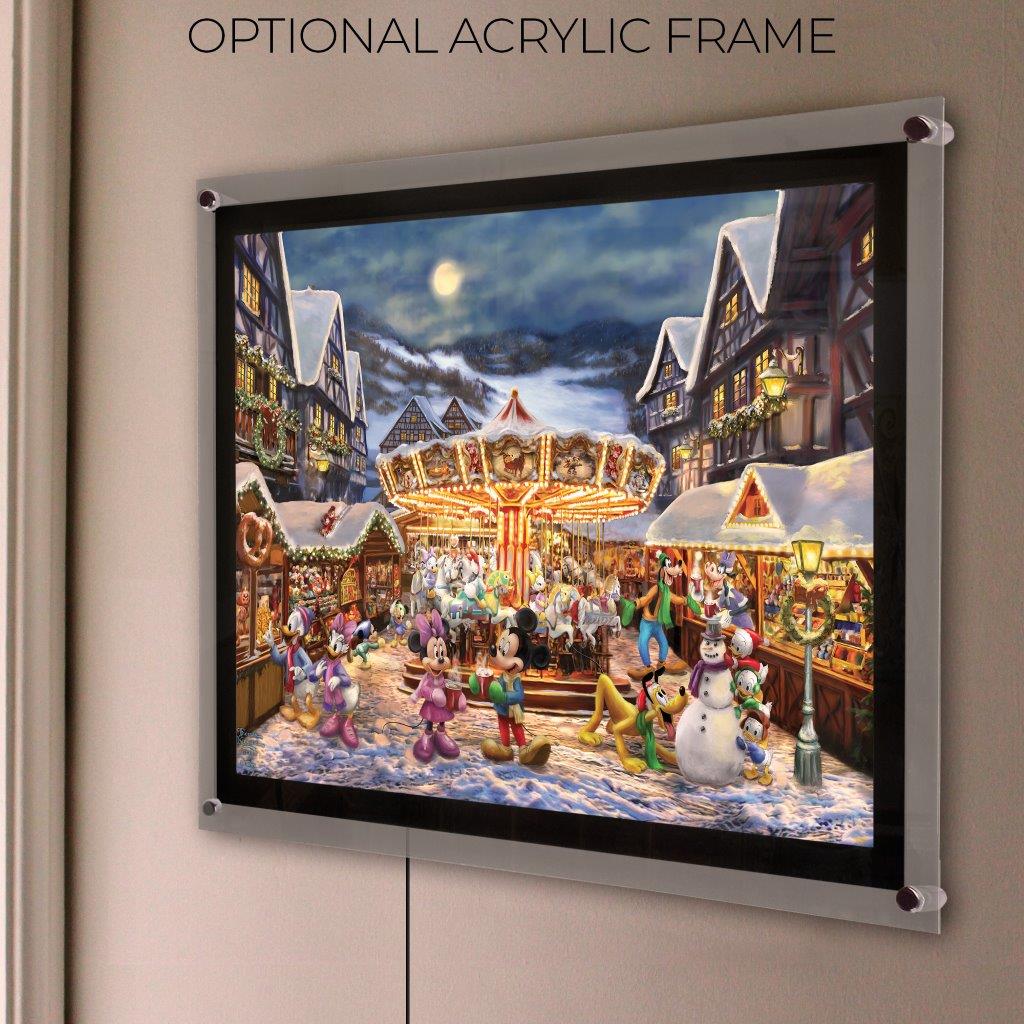 - This officially licensed Thomas Kinkade Studios Disney 24" x 17" MightyPrint™ Wall Art features Mickey and Minnie at a bustling Christmas market.