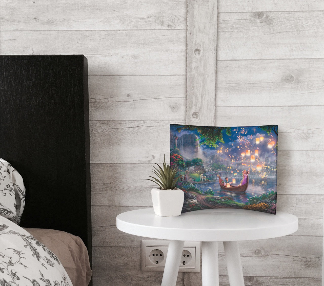 - Officially Licensed: Officially licensed Thomas Kinkade Disney curved acrylic print featuring Rapunzel and Flynn Rider in their iconic lantern scene, surrounded by the warm glow of floating lights over the water.
