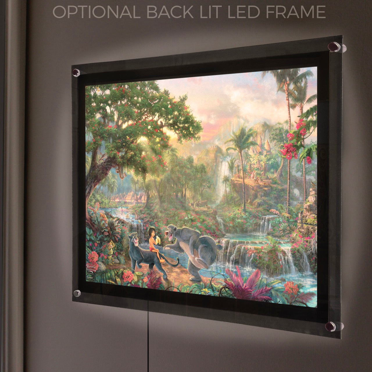 - Officially licensed Disney artwork by Thomas Kinkade Studios featuring Mowgli riding Bagheera while Baloo dances nearby, with Shere Khan and Kaa hidden in the jungle scene.