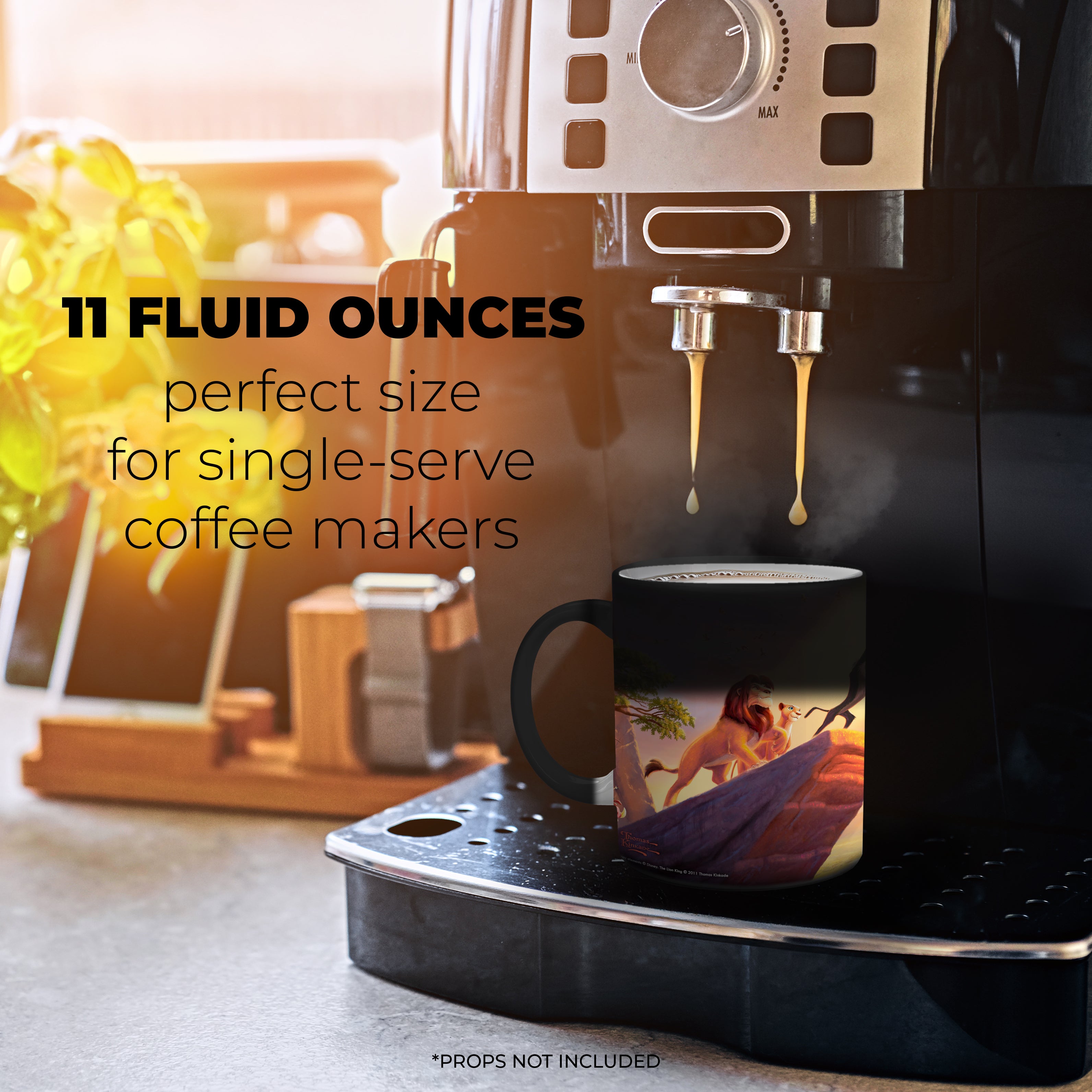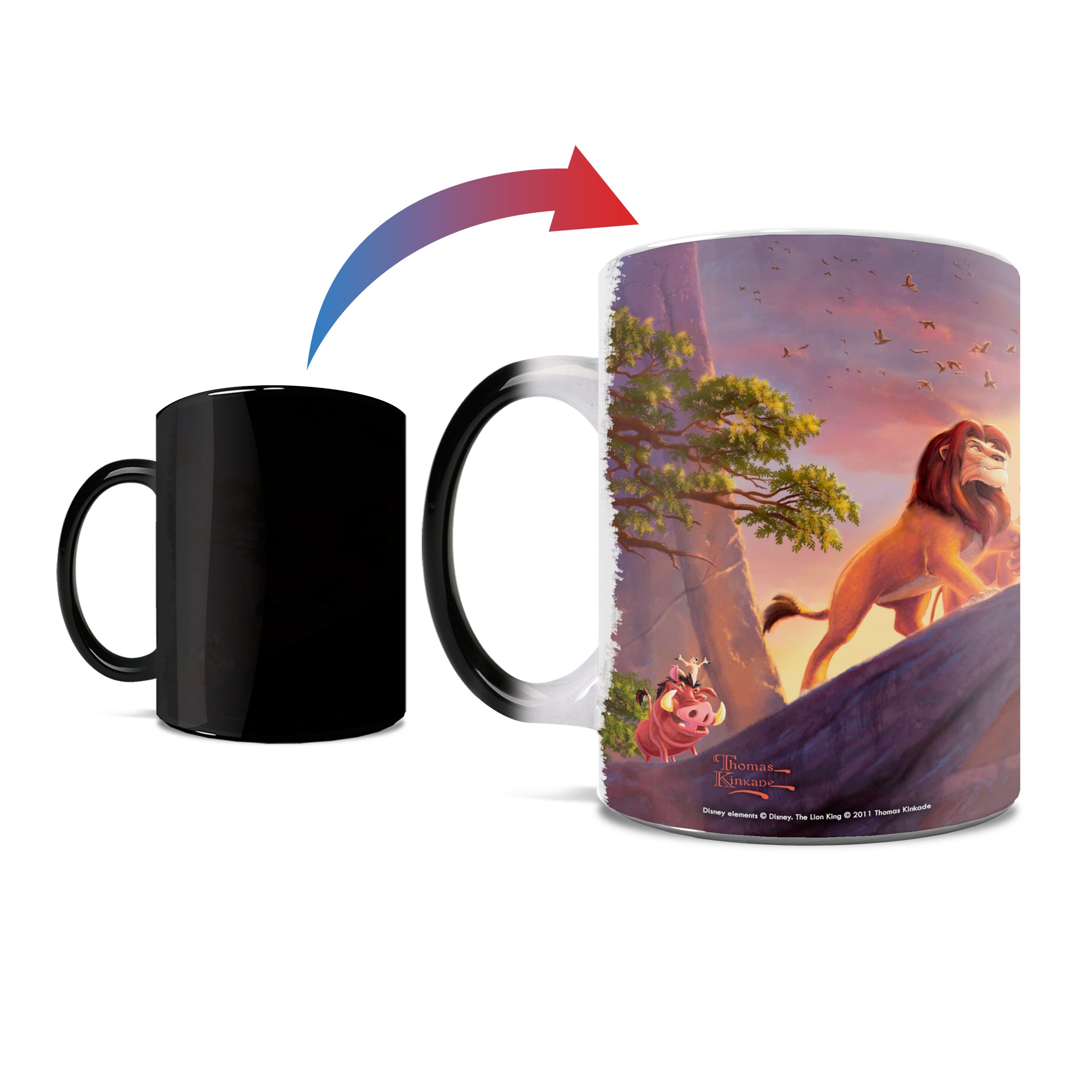 Bring the magic of Disney's The Lion King to your morning coffee with this Morphing Mugs® heat-sensitive mug. This collectible features an image of Thomas Kinkade's panoramic painting, The Lion King, done in Kinkade's instantly recognizable, luminous style. The exterior of this officially licensed 11oz mug transforms from black as hot liquid is added, revealing the hidden image in full vivid colors.