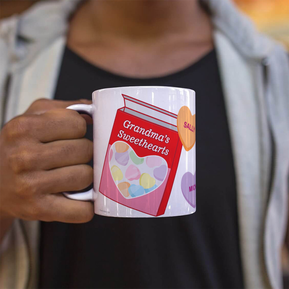 Nothing is sweeter than Grandma’s sweethearts! This 11 oz white ceramic mug features a design of a “Grandma’s Sweethearts” box that is overflowing with colorful candy hearts, each a different color. The heart-shaped candies are personalized with each grandchild’s name. An adorable custom gift perfect for grandma’s birthday, Valentine’s Day, Christmas and more!