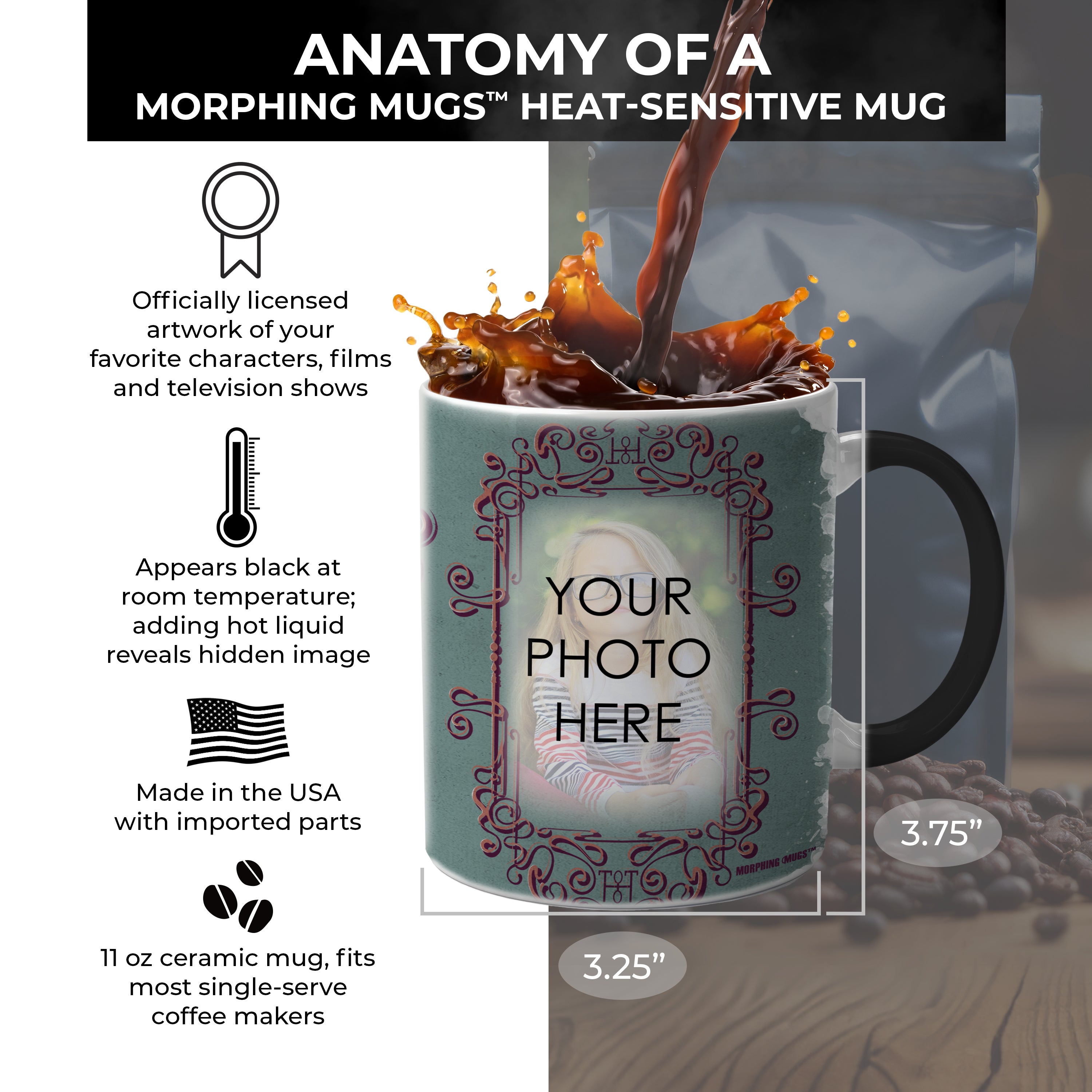 - Authentic Morphing Mugs heat-sensitive mug holds approximately 11ounces