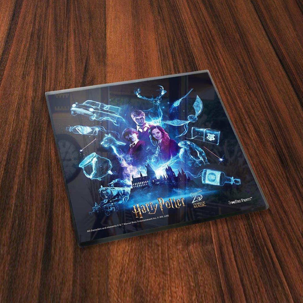 - Officially licensed Harry Potter StarFire Prints™ Glass Coaster Set featuring swirling blue, Patronus-like energy, iconic wizarding items, the Hogwarts silhouette, and fan-favorite characters.