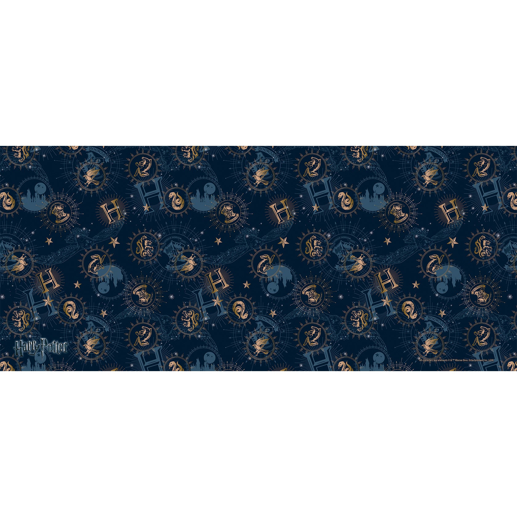 Elevate your décor with this captivating FilmPix™ Photo Insert featuring a celestial Harry Potter design. Perfectly suited for fans of the Wizarding World, this insert showcases iconic Hogwarts imagery, including the four Hogwarts House crests—Gryffindor, Hufflepuff, Ravenclaw, and Slytherin—arranged in a constellation-inspired pattern. Golden accents highlight key details such as the Hogwarts "H" and castle silhouettes, adding a touch of magic to any setting.