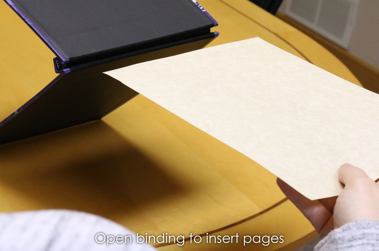 The easy-to-use open spine makes it simple to add, remove, and rearrange pages, so you can keep your best ideas exactly where you want them. You’ll also receive five blank sheets of parchment paper—perfect for doodles, notes, spells (the legal kind), or gifting a page to a fellow witch or wizard. To insert more paper or rearrange the pages in your book, gently flex the covers backward to where the inner spine opens. Slide your pages inside the spine, and your book is ready to be filled!