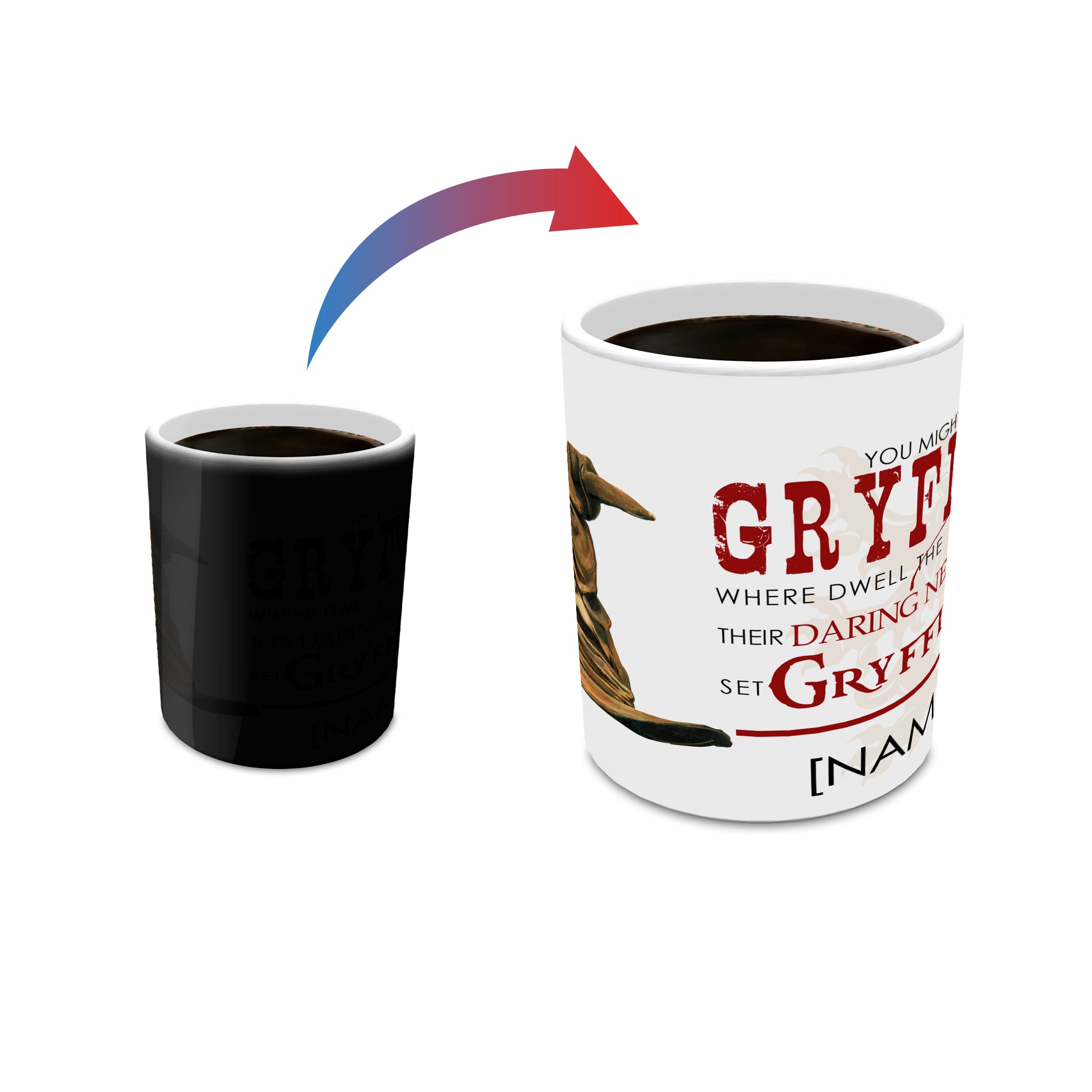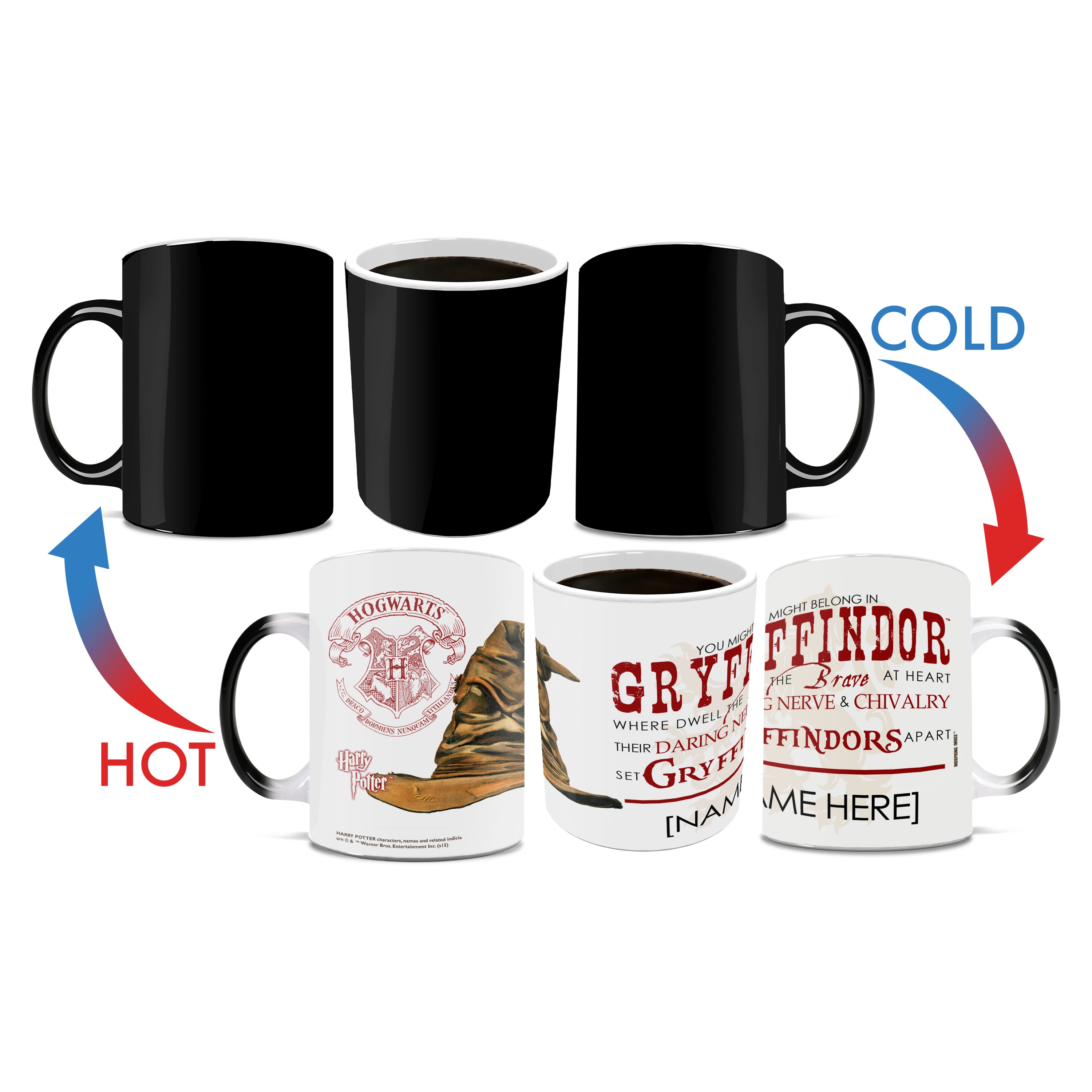 Pledge your allegiance to Gryffindor with this personalized Morphing Mugs® heat-sensitive, color-changing mug featuring the words of the house, an image of the Sorting Hat and the Hogwarts™ sigil; and your name added to the bottom. The exterior of this 11oz mug transforms from black as hot liquid is added! Watch as the heat-activated process reveals the hidden image in full vivid colors.