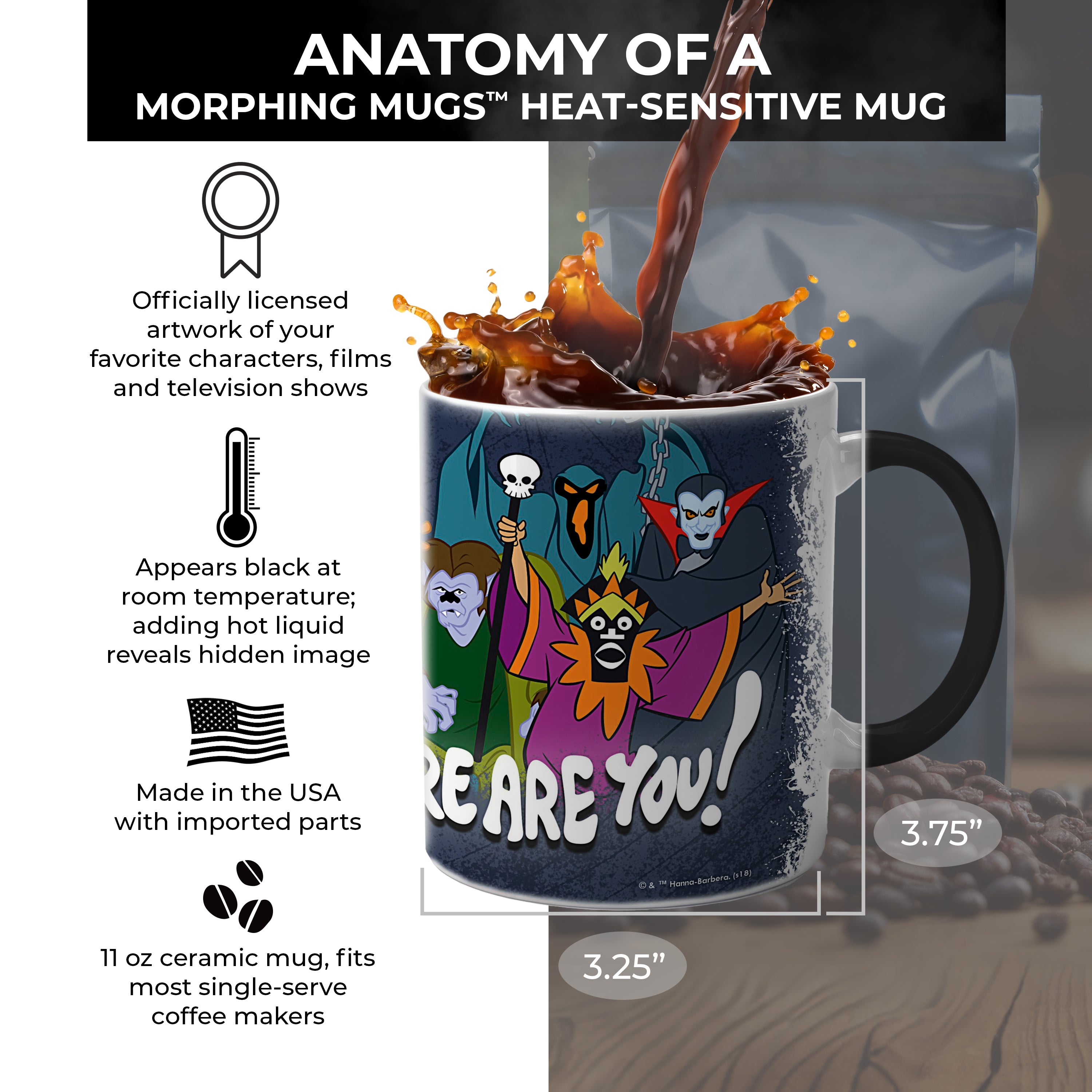 - Authentic Morphing Mugs™ heat-sensitive mug