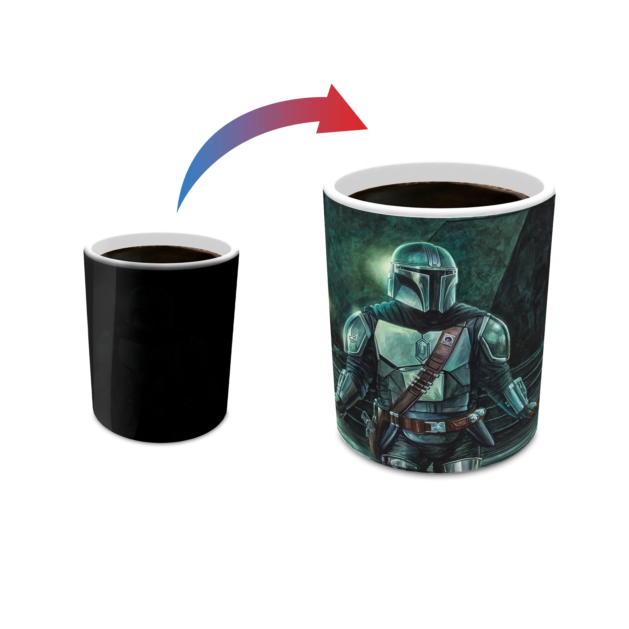 Transform your morning coffee routine with the 11 oz Morphing Mug® Heat-Sensitive Mug featuring The Mandalorian™. Witness the magic as your favorite Star Wars™ characters appear before your eyes when you pour in your hot beverage. The exterior of this officially licensed Morphing Mugs heat sensitive mug transforms from black as hot liquid is added, revealing the hidden image in full vivid colors.