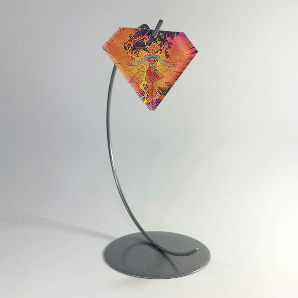 - Vibrant Acrylic Print – This 3. 5” x 2.6” DC Comics diamond-shaped Acrylic Print featuring Supergirl glowing with power against a vivid orange, pink, and purple cosmic background.