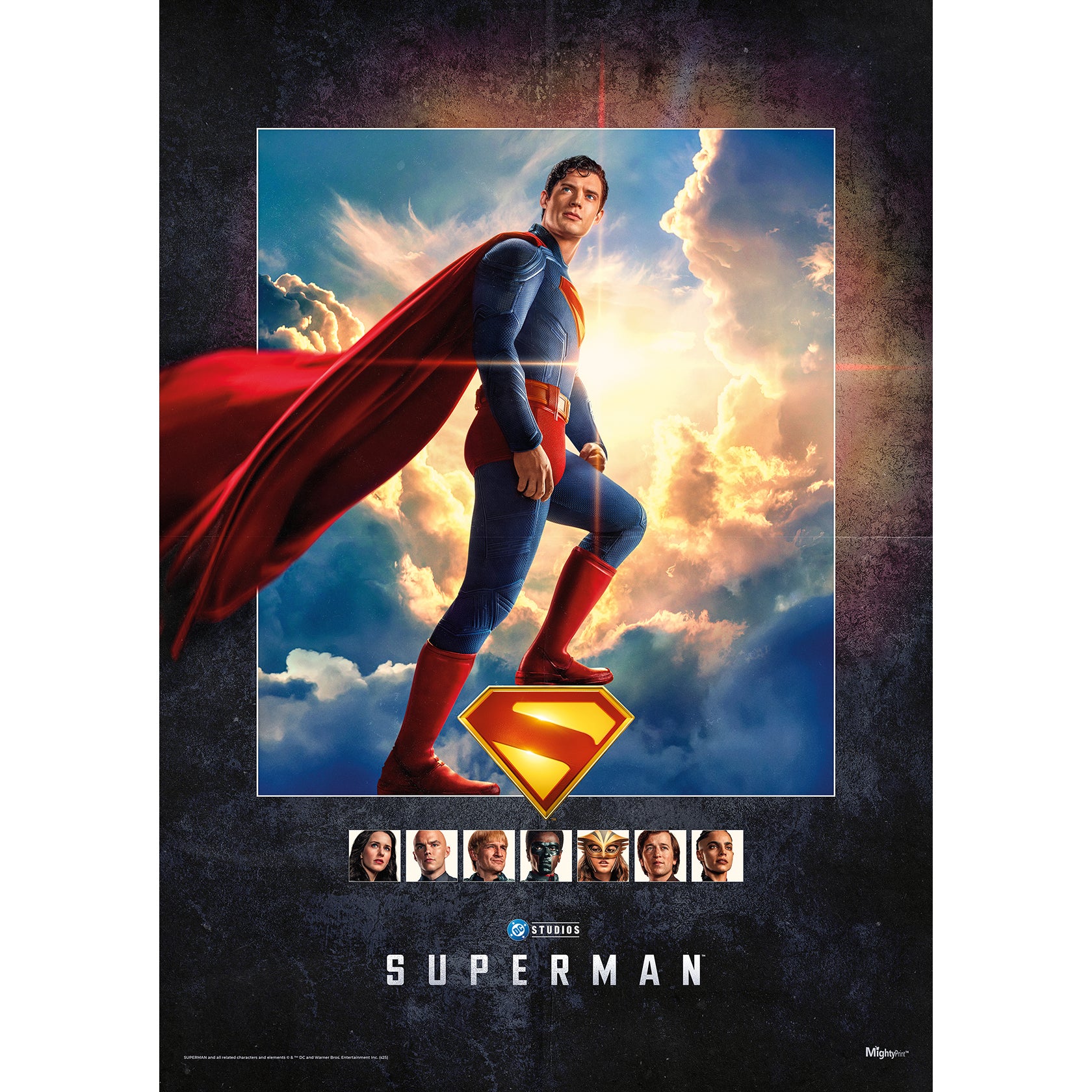 Superman soars above the clouds in this cinematic 17" x 24" MightyPrint™ Wall Art. Bathed in golden sunlight with his iconic red cape billowing behind him, the Last Son of Krypton steps forward in a bold, hopeful pose while the classic “S” shield emblem glows at the forefront. Along the bottom edge, a cast lineup from the film adds a collectible movie-poster feel that fans will want on display the moment they leave the theater.