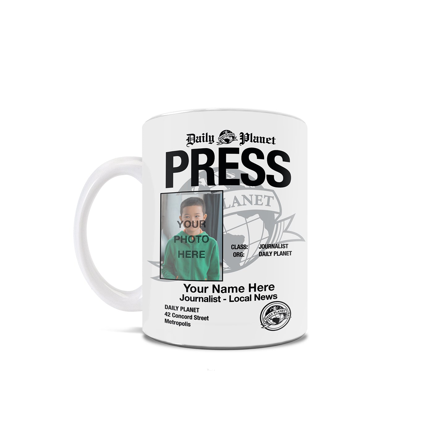 - Officially Licensed Mug – Superman (2025) 11 oz white ceramic mug designed to mimic an authentic Daily Planet press ID with your name and photo.