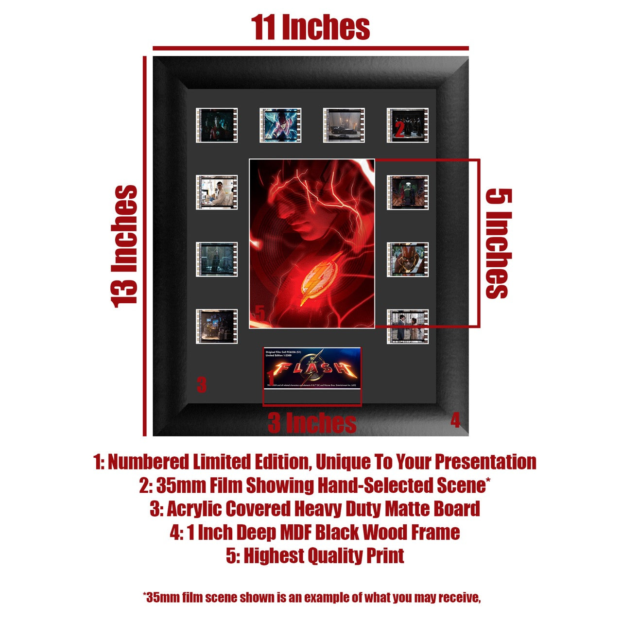 See the Flash as he rushes to save the world in 2023’s “The Flash”. This 11” x 13” Mini Montage FilmCells presentation features the image of the Flash surrounded by lighting with ten 35 mm carefully handcut film clips from “The Flash”. This FilmCells presentation also features a numbered limited edition name plaque – there are only 2500 pieces of this presentation available!