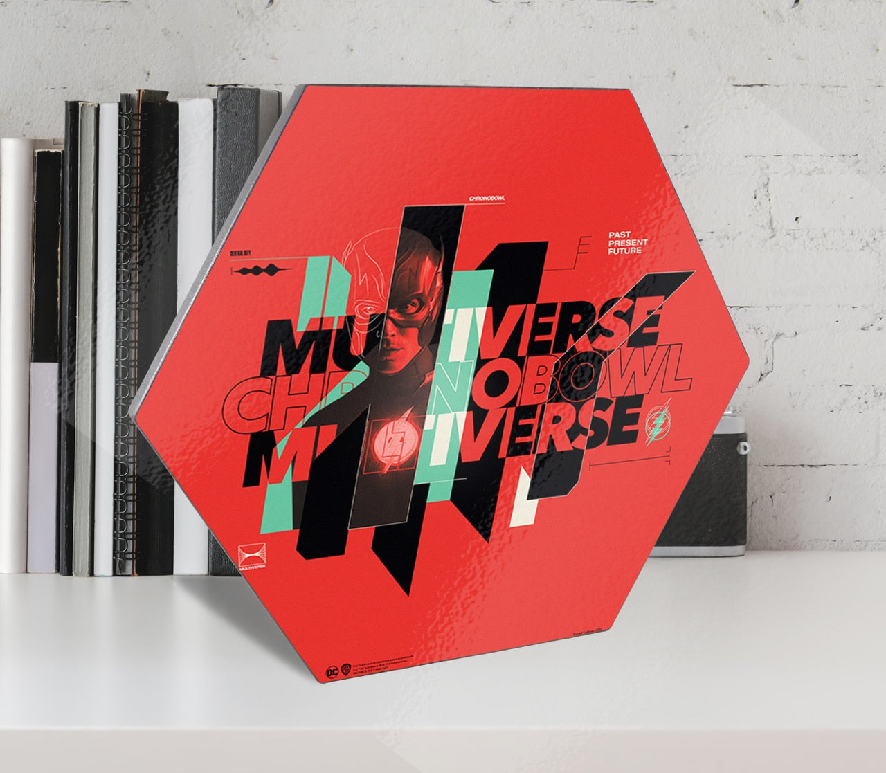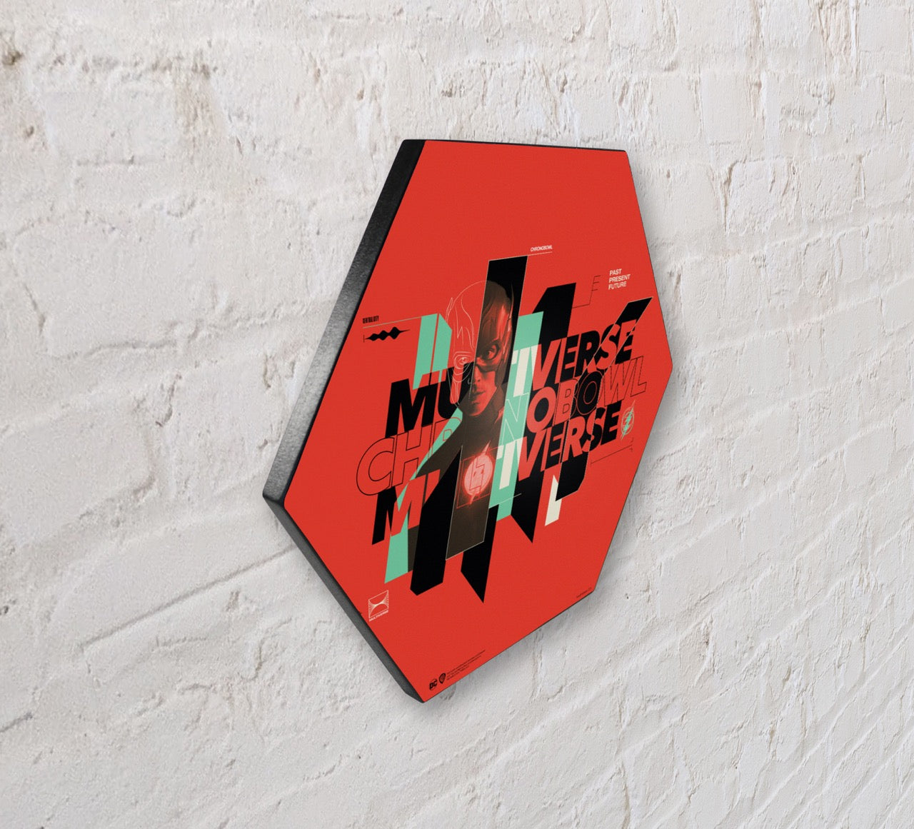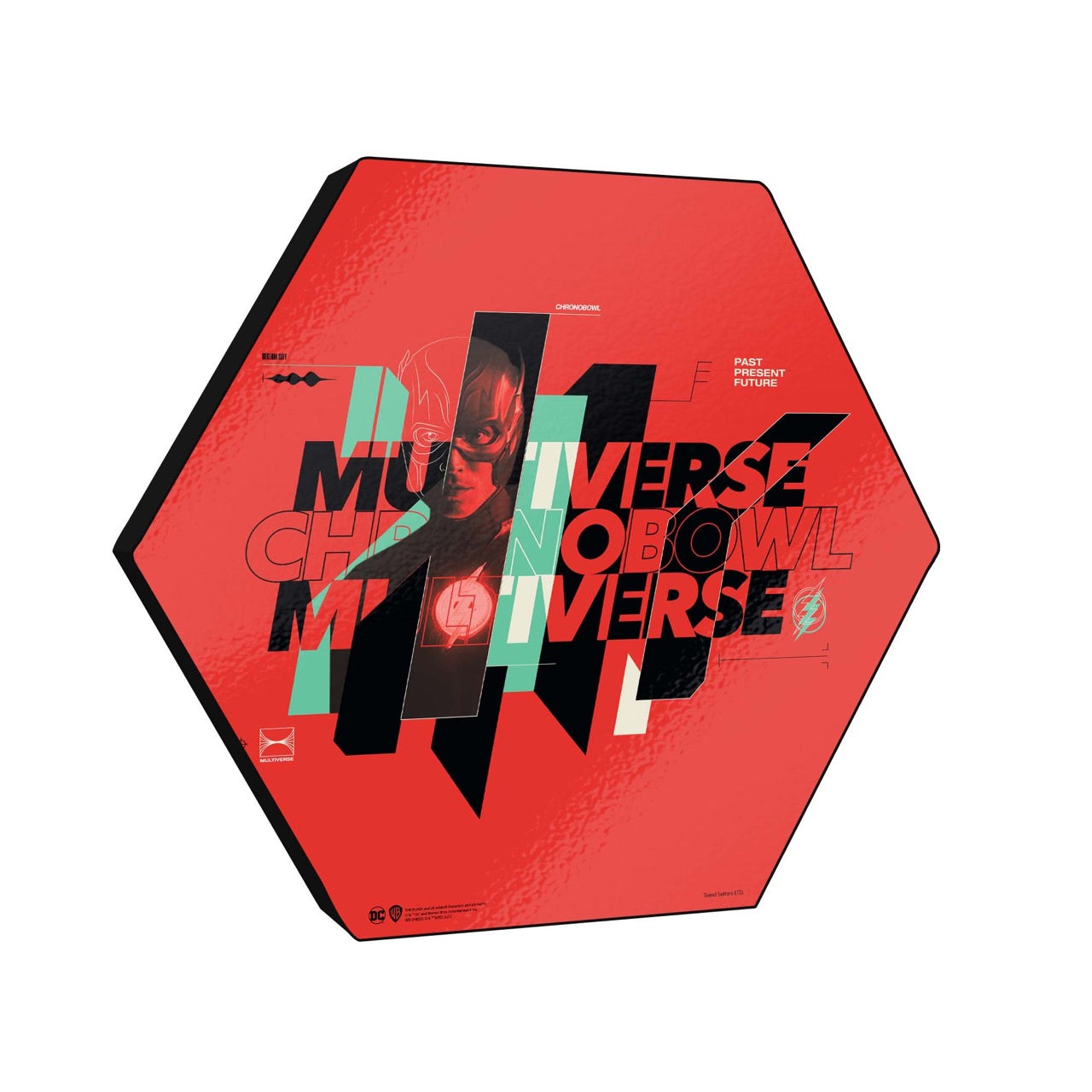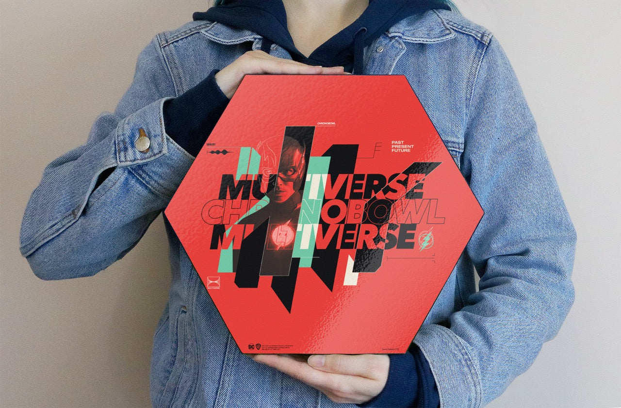 The multiverse. This 11.5" X 10" hexagon shaped décor displays the words "Multiverse Chronobowl Multiverse" against a red background. The Flash is featured amongst the lettering and the black and mint green stipe staggered center.