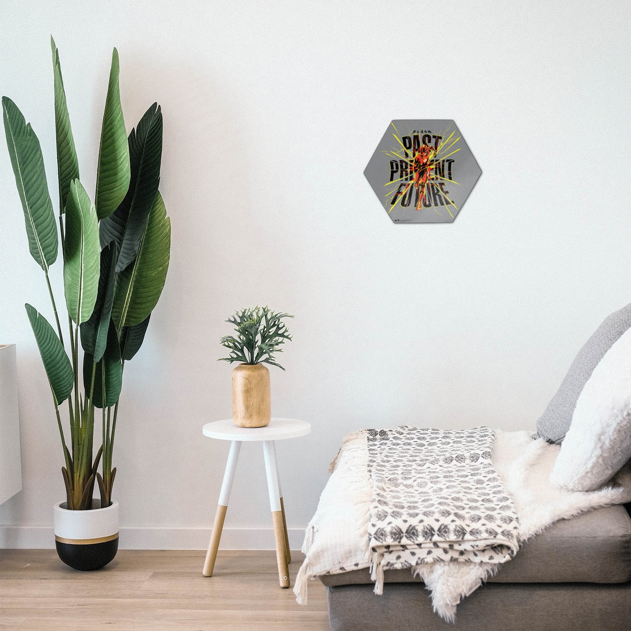 Where the past, present, and future meet... This 11.5" X 10" hexagon shaped décor displays the Flash in his iconic red suit with yellow lightning surrounding him as he takes off using his superspeed. The words "past", "present", and "future" are featured down the center of the print in a bold black with red lightning strikes. The Flash is ready for it all.