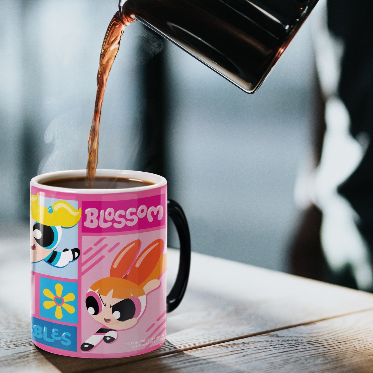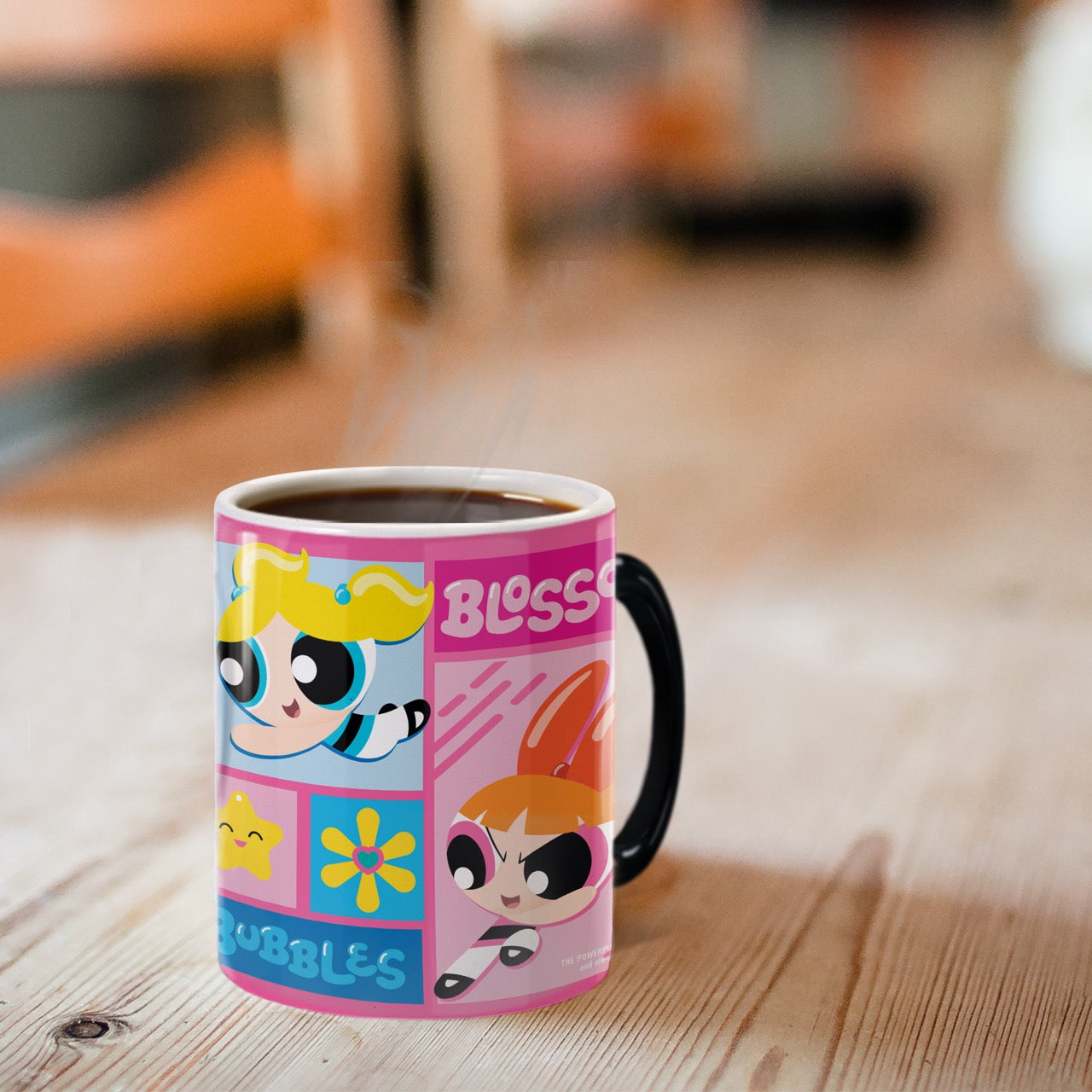Townsville’s most amazing trio. This 11 oz ceramic color-changing mug features the Powerpuff Girls, as they spring into action. Each girl is featured in her own square as she flies through the sky with her name in a rectangle nearby. These superpowered sisters are ready for action. The exterior of this officially licensed 11oz mug transforms from black as hot liquid is added, revealing the hidden image in full vivid colors.