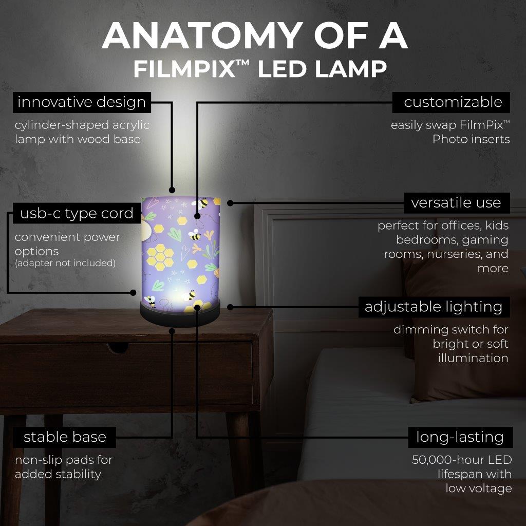 Add a personalized touch to your FilmPix™ Light Display with this adorable bee-themed FilmPix™ Photo Insert. Featuring a playful pattern of buzzing bees, vibrant honeycombs, cheerful flowers, and whimsical hearts against a lively purple backdrop, this insert brings a sweet and charming vibe to any room. The center banner allows for customization, making it perfect for adding a name or short meaningful phrase. Ideal for personalizing your FilmPix™ Light Display (sold separately), brighten your space with a delightful design that celebrates nature and creativity while creating a unique, memorable gift or decor piece. Transform your space with this fun, customizable insert that stands out!