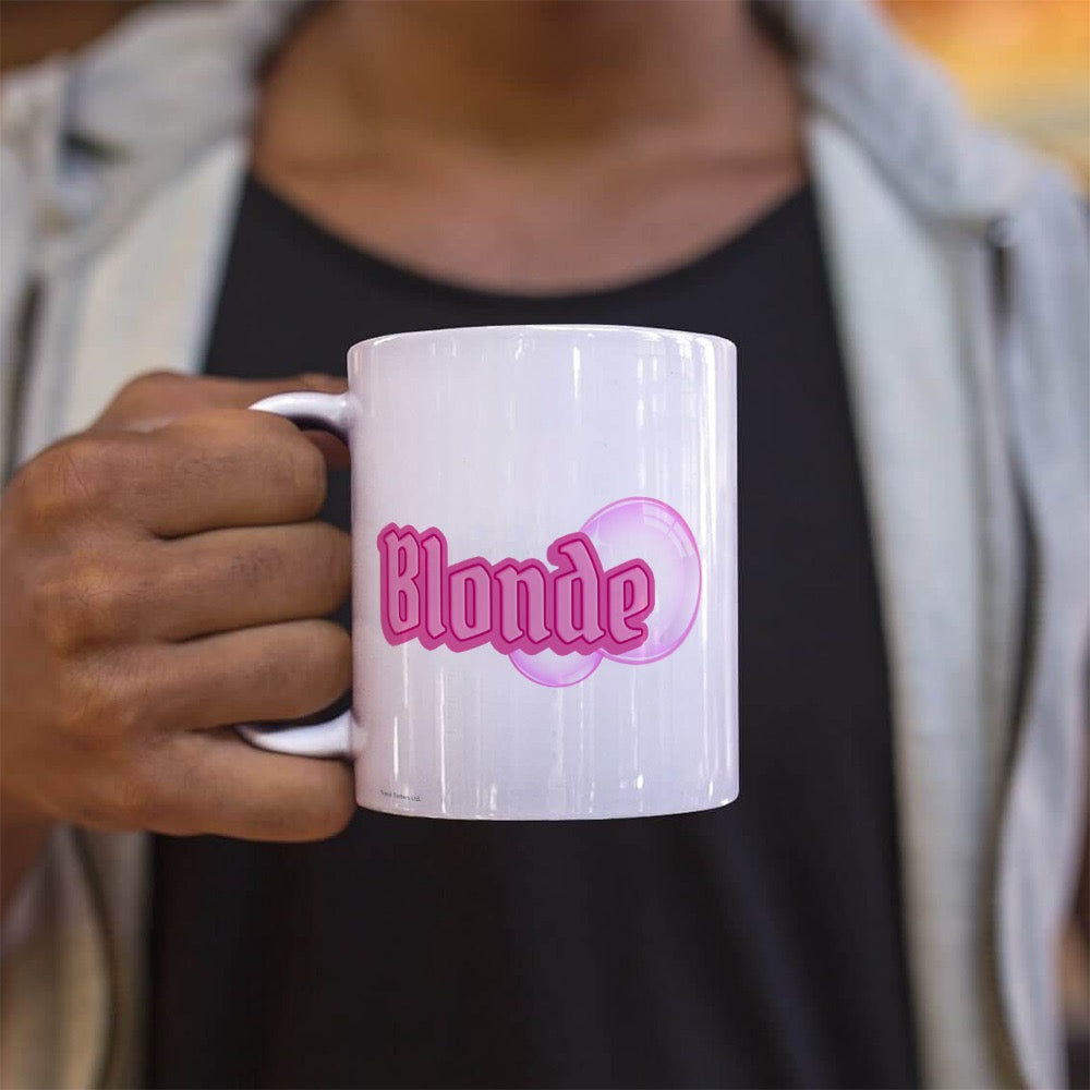 - Perfect Size – Trend Setters Original 11 oz ceramic mug featuring the word “Blonde” in vibrant pink bubble-style lettering that pops against a glossy white ceramic backdrop.
