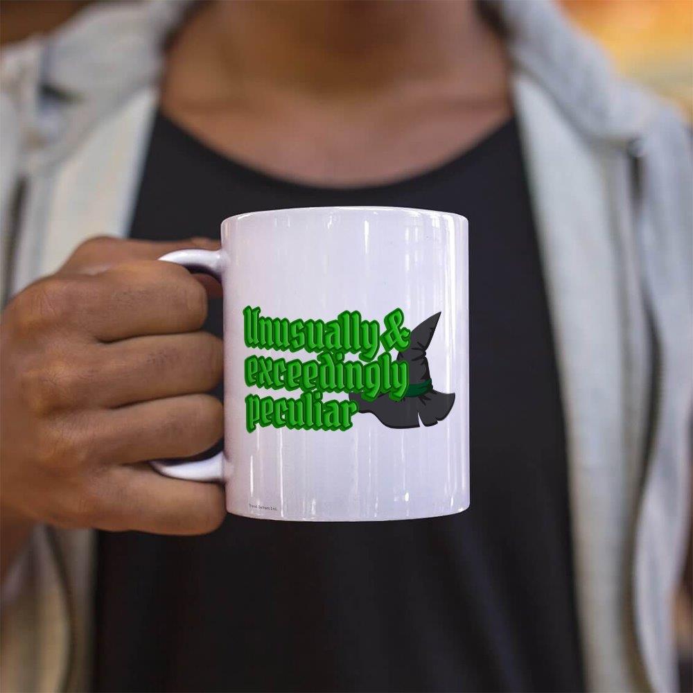 - Perfect Size – Trend Setters Original 11 oz ceramic mug featuring the phrase “Unusually & Exceedingly Peculiar” with a witch hat design.