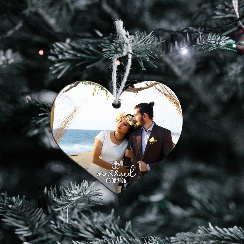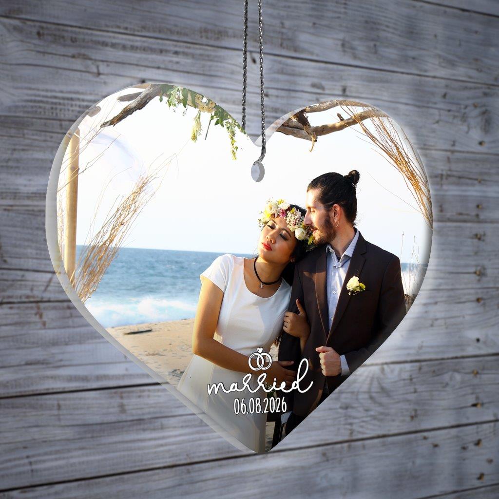 Turn your favorite wedding photo into a keepsake you’ll want to display all year. This heart-shaped Hanging Acrylic Print features your own photo, a delicate “married” script with wedding rings, and a custom date to celebrate your big day. Printed directly onto smooth, clear acrylic, your image appears vibrant and glossy while still letting light pass through for a beautiful, light-catching effect.