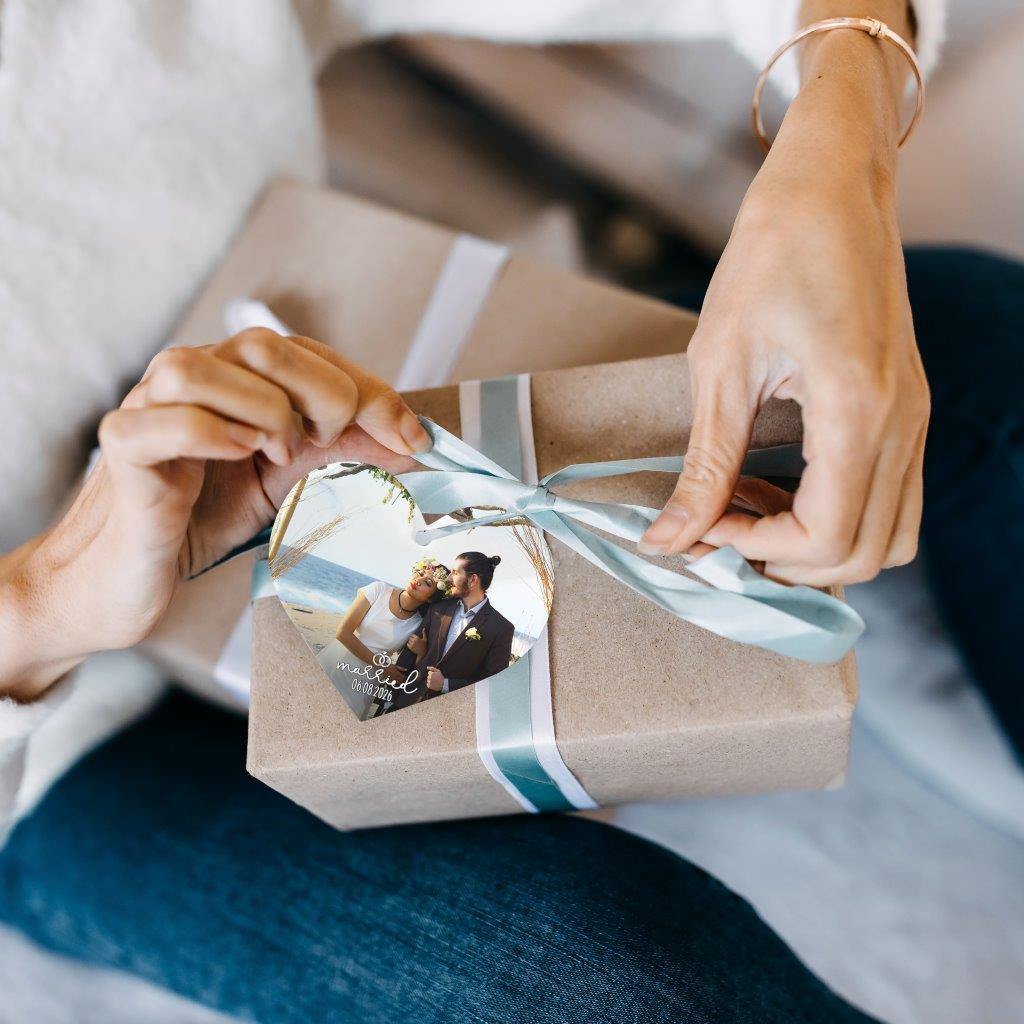 - Trend Setters Original heart-shaped hanging acrylic print featuring your favorite wedding photo, and customized date to create a one-of-a-kind keepsake that’s uniquely yours.