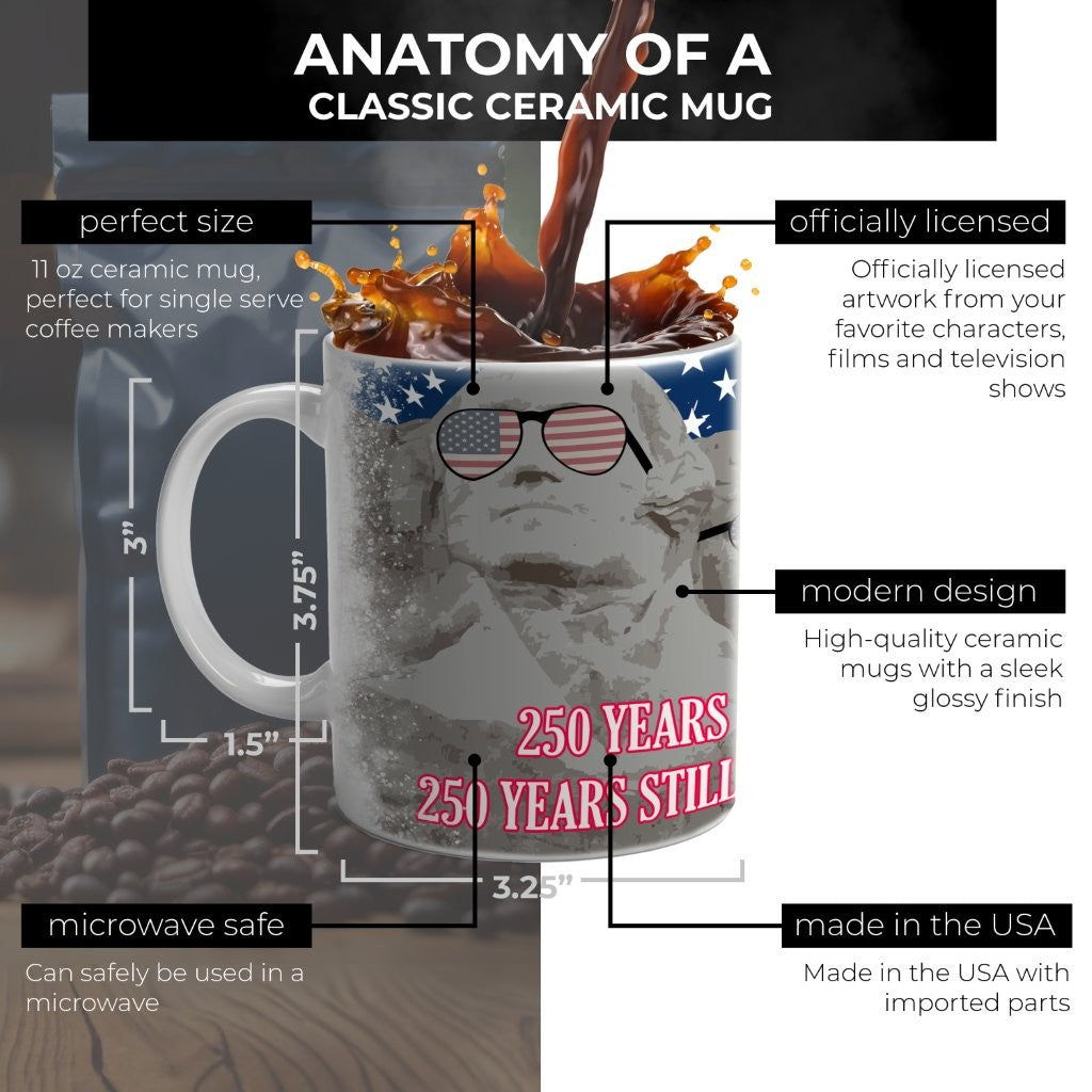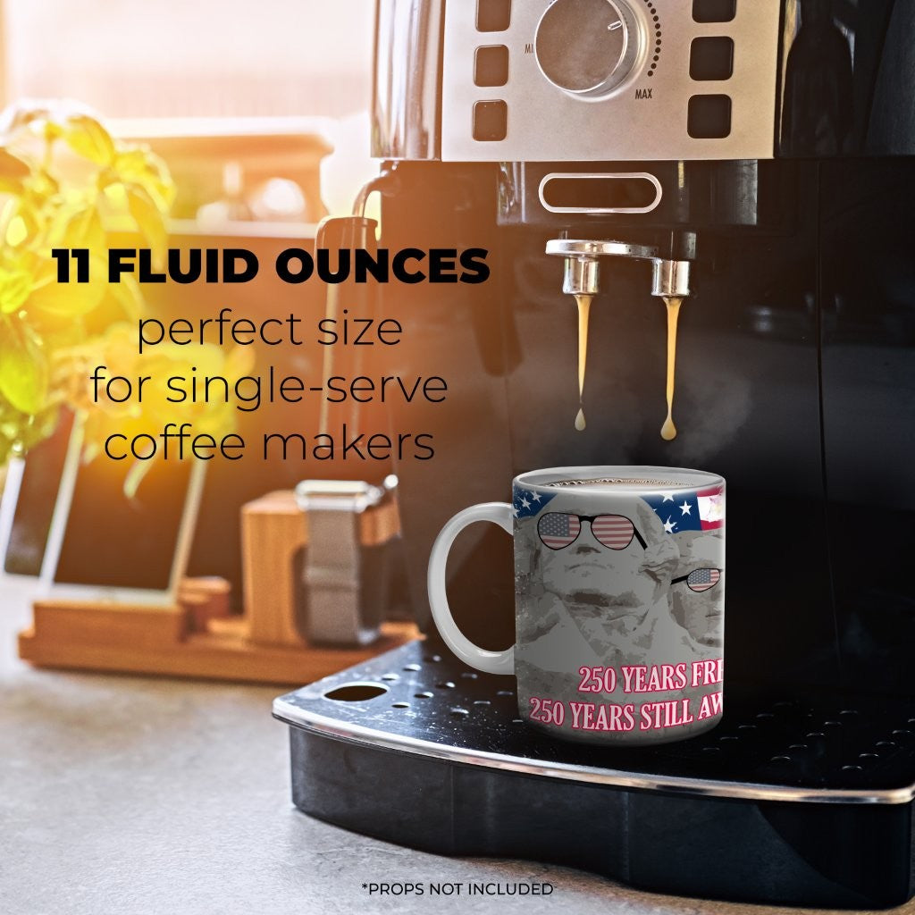- Perfect Size – Trend Setters Original 11 oz white ceramic mug features Mount Rushmore wearing American-flag sunglasses with a bald eagle, stars and stripes, fireworks, and the phrase “250 Years Free / 250 Years Still Awesome.”