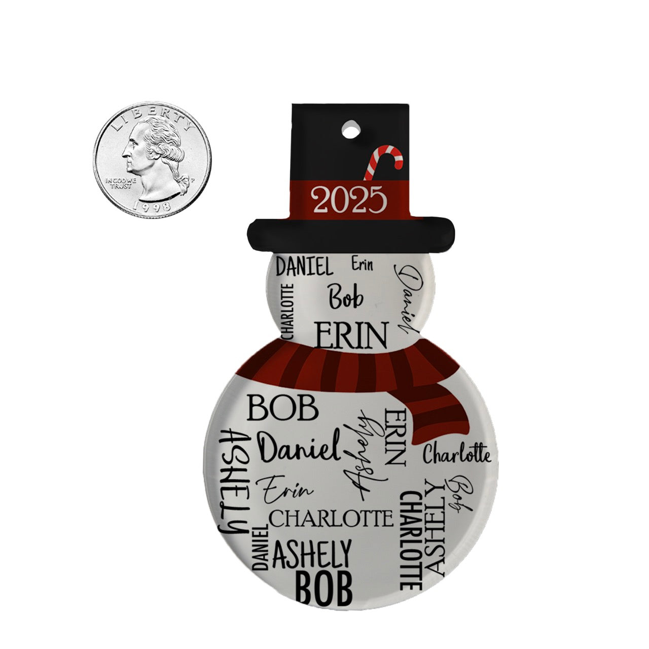 Celebrate the whole crew with this personalized Snowman Name Hanging Acrylic Print. Featuring a playful snowman with a red scarf, this customizable piece is filled with the names you choose, artfully arranged in a mix of stylish fonts. Add your special year in the snowman’s top hat, and you’ve got a festive keepsake that captures your family story in a fun, modern way. Lightweight and durable, this hanging acrylic print is perfect for displaying on a tree, wreath, mantle hook, or gift bag for an extra personal touch all season long.