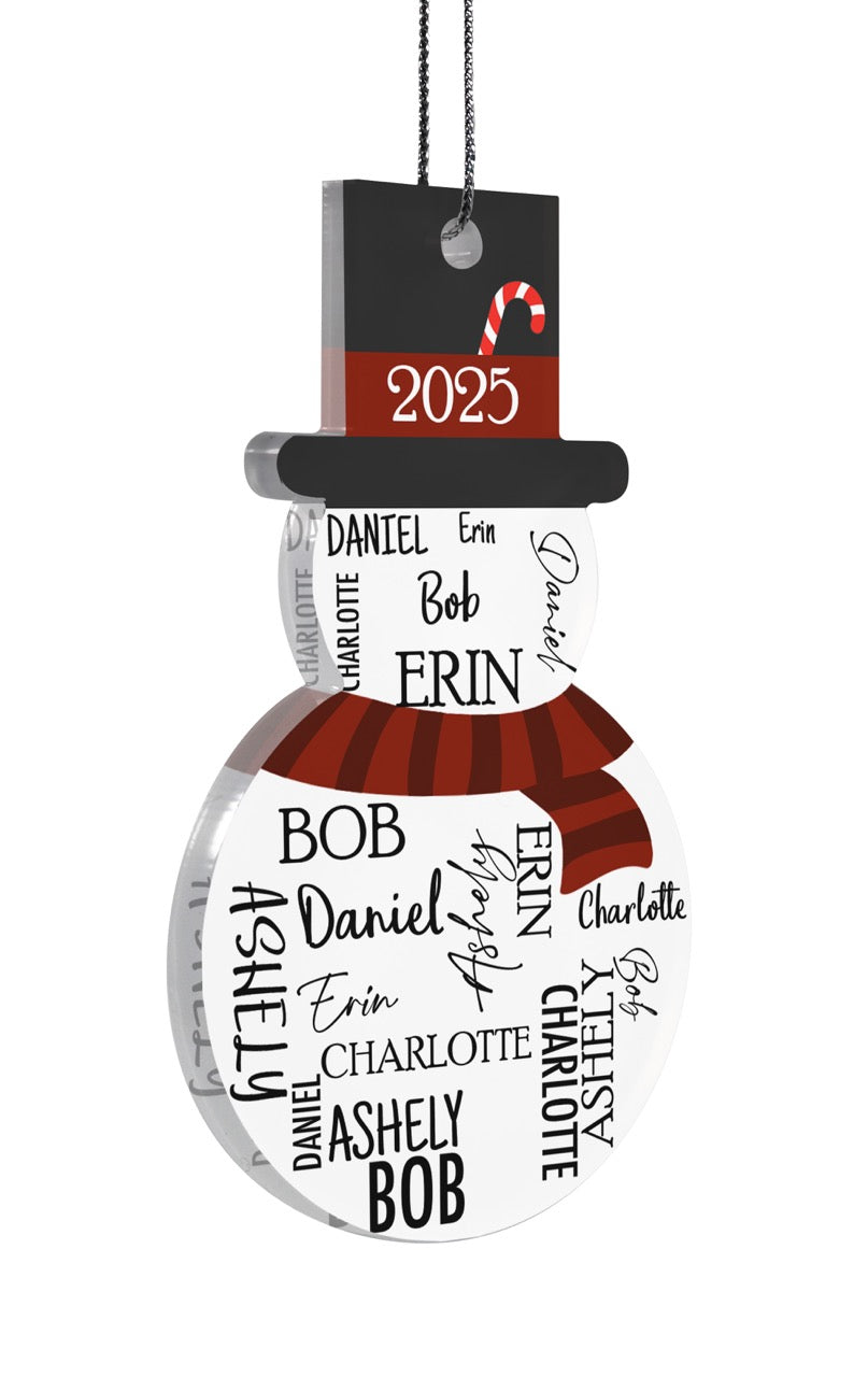 - Vibrant Acrylic Print – This Trend Setters Original Hanging Acrylic Print featuring a playful snowman with a red scarf filled with the five (5) names you choose, artfully arranged in a mix of stylish fonts.