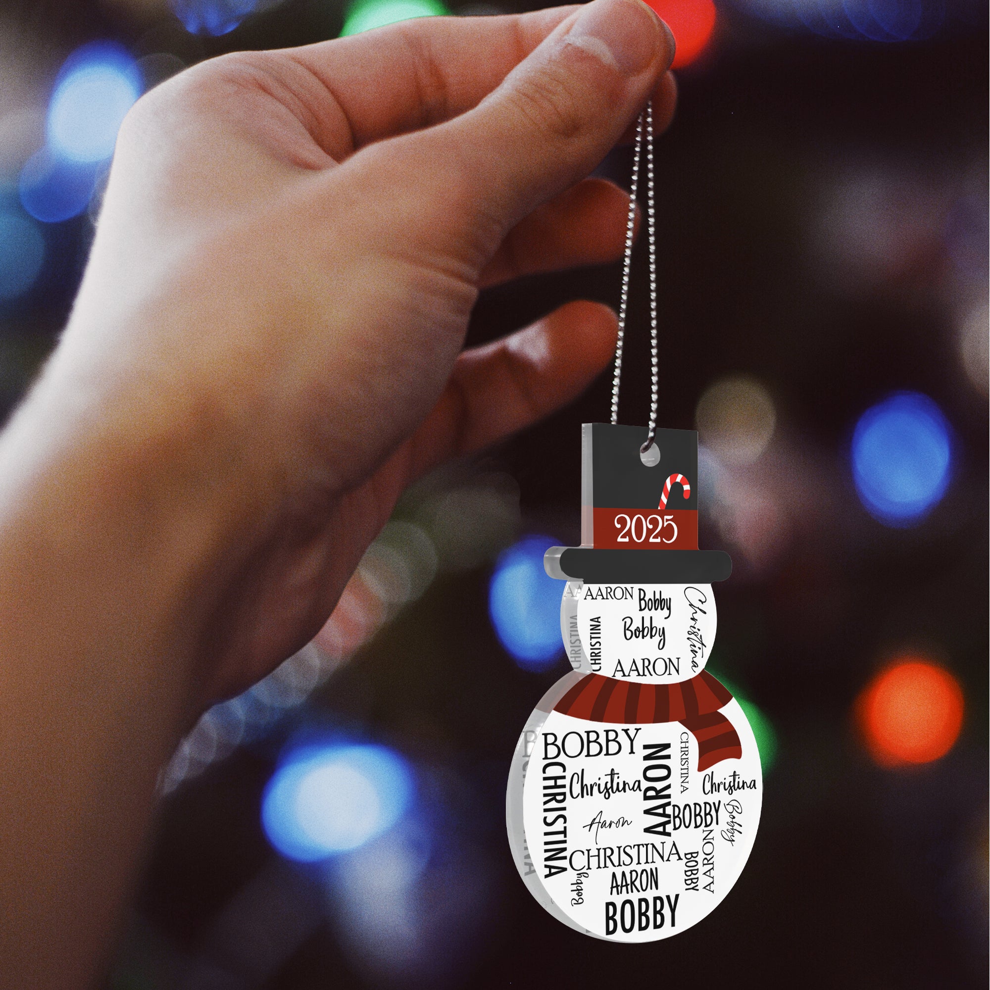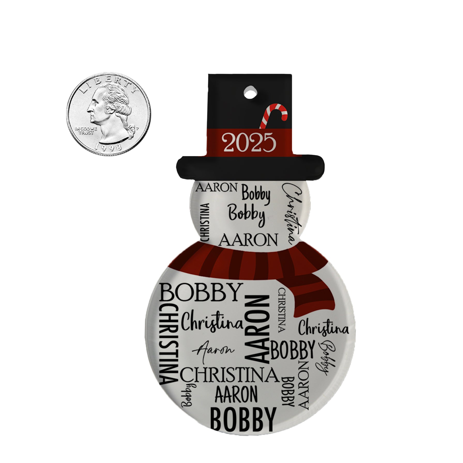 Celebrate the whole crew with this personalized Snowman Name Hanging Acrylic Print. Featuring a playful snowman with a red scarf, this customizable piece is filled with the names you choose, artfully arranged in a mix of stylish fonts. Add your special year in the snowman’s top hat, and you’ve got a festive keepsake that captures your family story in a fun, modern way. Lightweight and durable, this hanging acrylic print is perfect for displaying on a tree, wreath, mantle hook, or gift bag for an extra personal touch all season long.