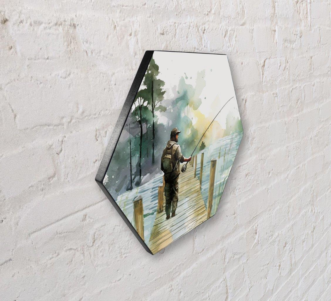 - Hexagonal Wood Print – Trend Setters Original design featuring a tranquil watercolor-style scene of a fisherman standing on a rustic dock surrounded by misty waters and forested reflections.