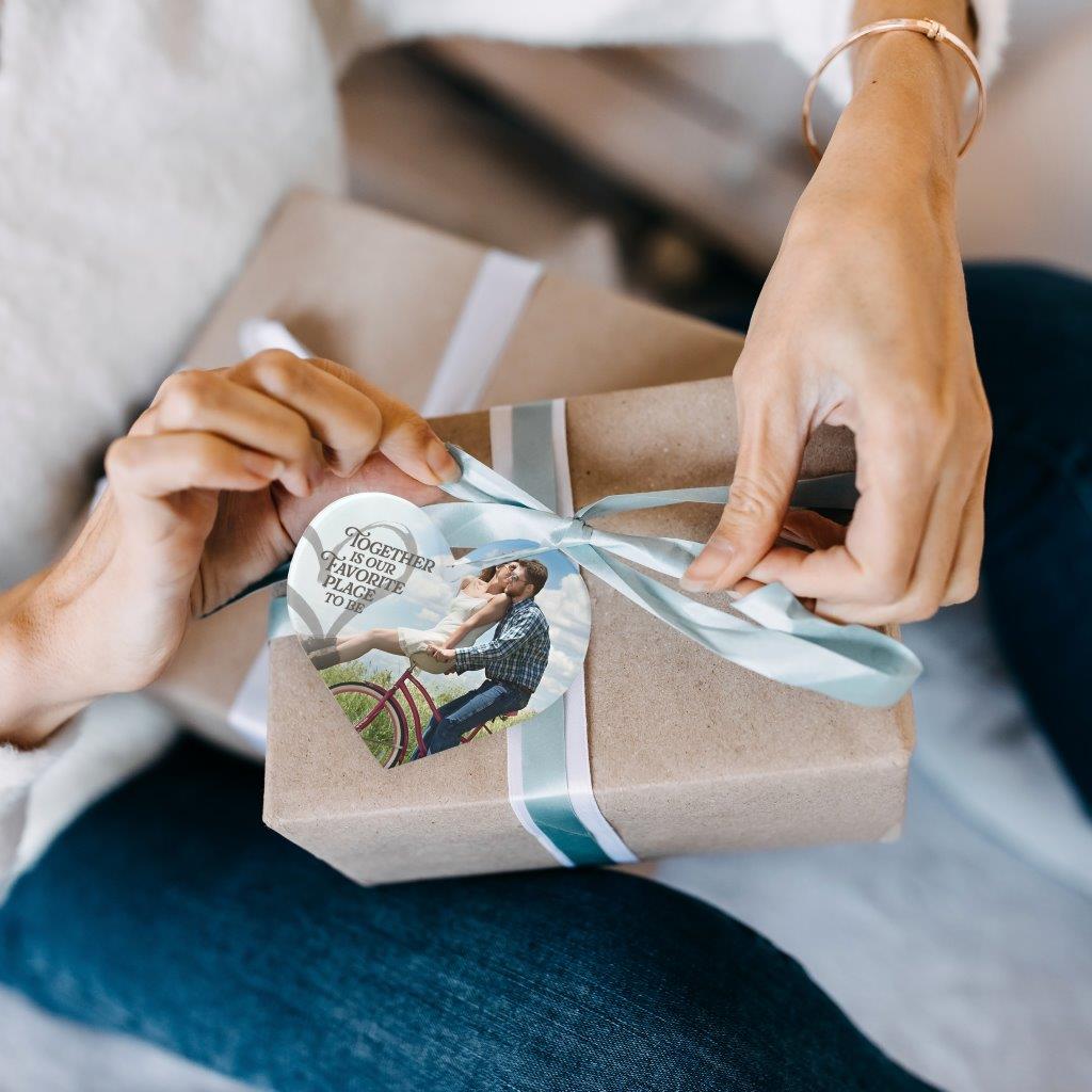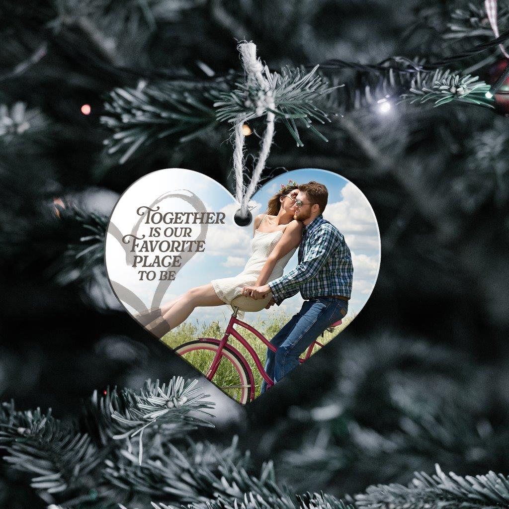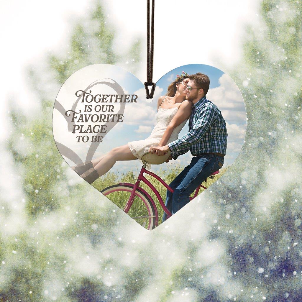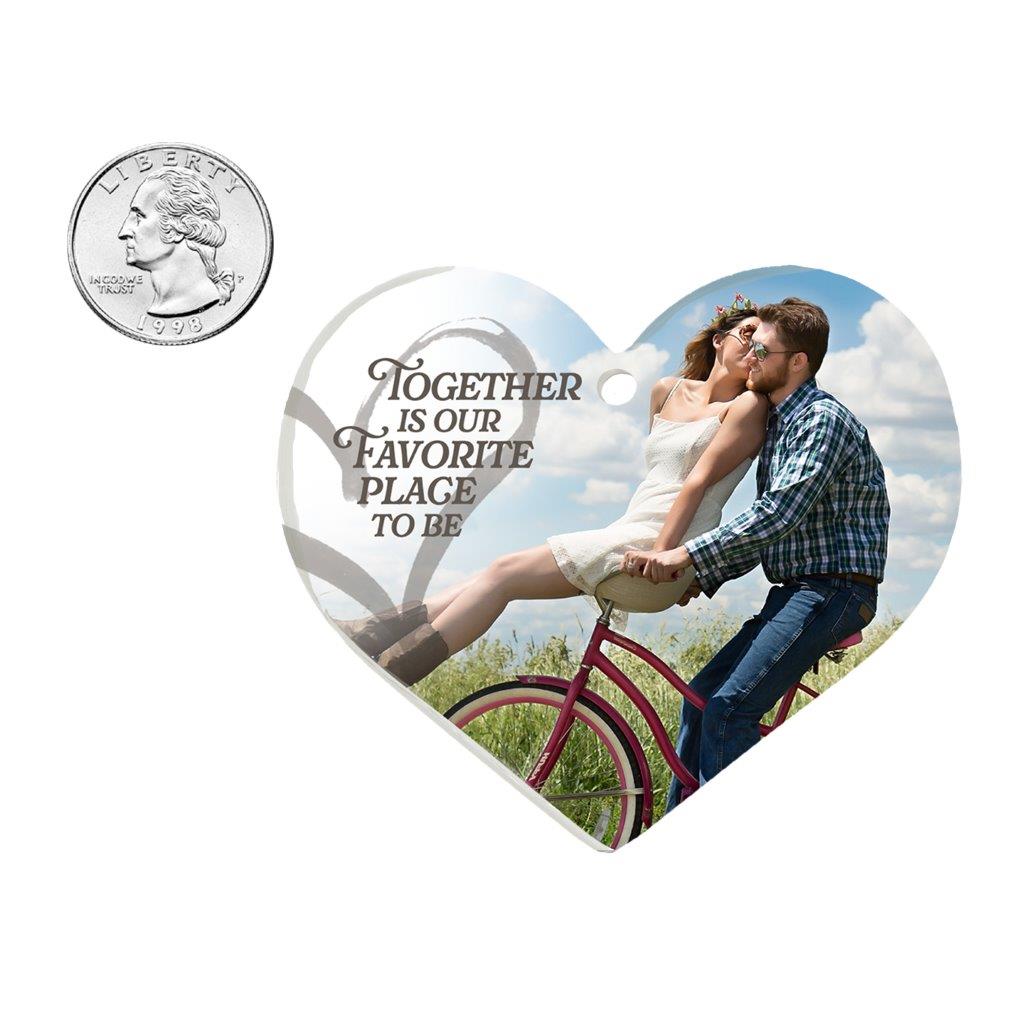 - Trend Setters Original heart-shaped hanging acrylic print featuring your custom photo with the sweet phrase, “Together is our favorite place to be.”.