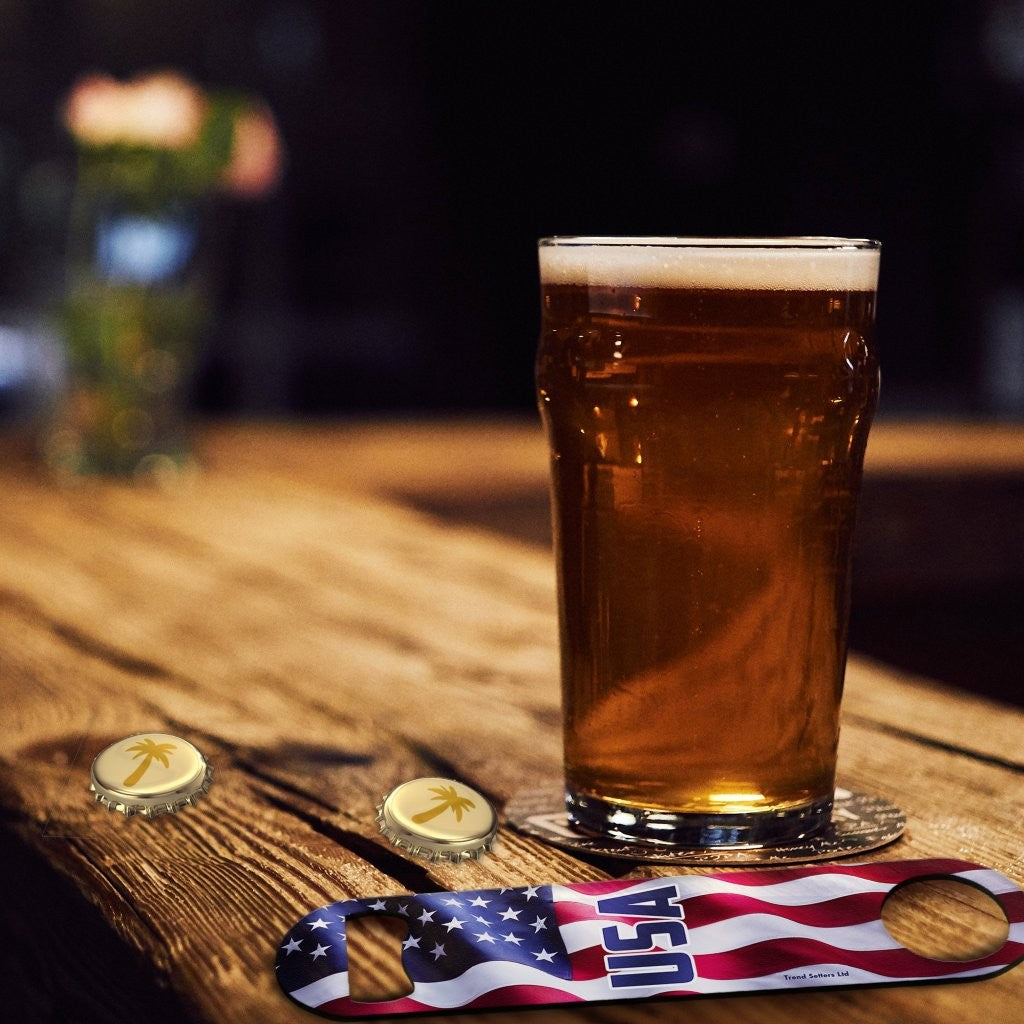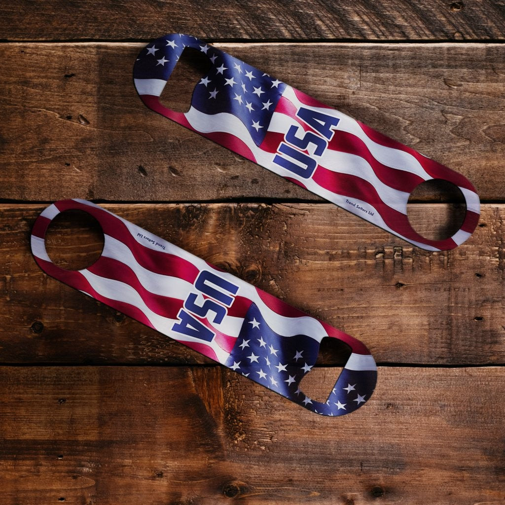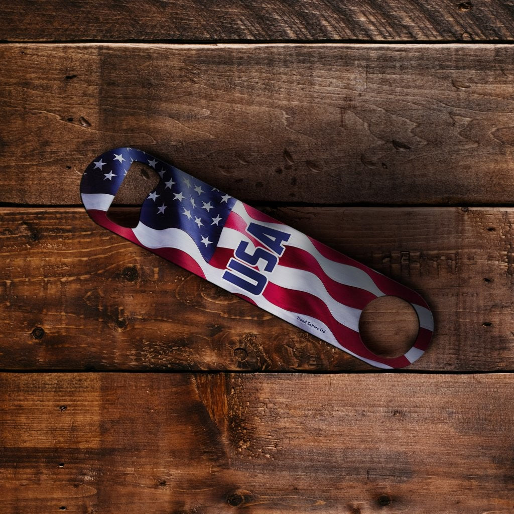 Pop the top with a little red, white, and crack! This Metal Bar Blade Bottle Opener features a bold USA flag design with “USA” front and center—built for fast, one-handed cap removal, whether you’re behind the bar, at a backyard BBQ, or tailgating on game day. The classic bar-blade shape sits comfortably in your hand, slips easily into a pocket or apron, and feels right at home in any home bar setup.